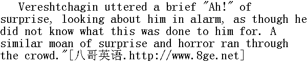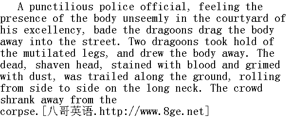 啊!"韦列夏金吃惊地叫了一声, 恐惧地环顾四周, 似乎还不明白, 为什么这事发生在他身上。人群同样发出恐惧的惊叹。 "O Lord!" some one was heard to utter mournfully. After the exclamation of surprise that broke from Vereshtchagin he uttered a piteous cry of pain, and that cry was his undoing. The barrier of human feeling that still held the mob back was strained to the utmost limit, and it snapped instantaneously. The crime had been begun, its completion was inevitable. The piteous moan of reproach was drowned in the angry and menacing roar of the mob. Like the great seventh wave that shatters a ship, that last, irresistible wave surged up at the back of the crowd, passed on to the foremost ranks, carried them off their feet and engulfed all together. The dragoon who had struck the victim would have repeated his blow. Vereshtchagin, with a scream of terror, putting his hands up before him, dashed into the crowd. The tall young man, against whom he stumbled, gripped Vereshtchagin's slender neck in his hands, and with a savage shriek fell with him under the feet of the trampling, roaring mob. Some beat and tore at Vereshtchagin, others at the tall young man. And the screams of persons crushed in the crowd and of those who tried to rescue the tall young man only increased the frenzy of the mob. For a long while the dragoons were unable to get the bleeding, half-murdered factory workman away. And in spite of all the feverish haste with which the mob strove to make an end of what had once been begun, the men who beat and strangled Vereshtchagin and tore him to pieces could not kill him. The crowd pressed on them on all sides, heaved from side to side like one man with them in the middle, and would not let them kill him outright or let him go." 哦, 上帝!"不知谁发出悲伤的叹息。韦列复金在发出那声惊叫之后, 紧接着又痛得他可怜地呼喊, 而这一声呼喊倒要了他的命。压力达到极限的人类感情的堤防, 刚才还控制着人群, 现在顷刻瓦解了。罪行既然开了头, 就必须会把它干到底。责难的哀吟, 淹没在人群雷霆怒吼之中。这最后一次不可遏制的波浪, 就像最后的, 击碎船只的七级浪一样利害, 从后面几排涌到前排, 冲倒他们, 吞没了一切。砍了一刀的龙骑兵想再砍一刀。韦列夏金恐怖的叫着, 抱头跑向人群。高个小伙子被他撞了一下, 趁势伸出两手卡住韦列夏金细长的脖颈, 狂叫着和他一起跌倒在挤成一团的吼叫着的人群脚下。一些人扭打韦列夏金, 另一些人扭打高个小伙子。被压在下面的人的喊叫, 和奋力救助高个小伙子的人的呼喊, 只激起了人群的狂怒。很长时间, 龙骑兵老是解救不出那个满脸是血, 被打得半死的工人。尽管人群迫不及待地奋力要把已经开了头的事情进行到底, 但很长时间, 那些扑打韦列夏金, 想要卡死他撕碎他的人, 都未能整治死他;人群从各个方向朝他们压过来, 以他们为中心, 形成一团板块, 从一边到另一边地晃来晃去, 既不让他们有机会打死他, 又不让他们放掉他。 "Hit him with an axe, eh? ... they have crushed him ... Traitor, he sold Christ! ... living ... alive ... serve the thief right. With a bar! ... Is he alive? ..."" 用斧子砍呀, 怎么样?......压成团了......叛徒, 出卖了基督!......活着......还活着......恶人活该受罪。用门闩揍!......还没死啊!" Only when the victim ceased to struggle, and his shrieks had passed into a long-drawn, rhythmic death-rattle, the mob began hurriedly to change places about the bleeding corpse on the ground. Every one went up to it, gazed at what had been done, and pressed back horror-stricken, surprised, and reproachful. 直到牺牲品不再挣扎, 它的呐喊变成有节奏的悠长的嘶哑的喘息, 人群方才匆忙离开倒在地上浑身是血的尸体。刚才得以接近并且目睹这一情景的每一个人, 此刻带着恐怖、责备、惊慌的神情纷纷朝后边挤去。 "O Lord, the people's like a wild beast; how could he be alive!" was heard in the crowd. "And a young fellow too ... must have been a merchant's son, to be sure, the people ... they do say it's not the right man ... not the right man! ... O Lord! ... They have nearly murdered another man; they say he's almost dead ... Ah, the people ... who wouldn't be afraid of sin ..." were saying now the same people, looking with rueful pity at the dead body, with the blue face fouled with dust and blood, and the long, slender, broken neck." 哦, 上帝, 人跟野兽一样, 哪儿有活路哟!"人群里有人说。"小小的年纪......怕是买卖人家的孩子, 那样的一帮人啊!......据说, 不是那一个......怎么不是那一个......呵, 上帝!......听说还有一个挨了打, 差不多要死了......唉, 这些人啊......不怕作孽......"那些人现在又这样说, 用病态的怜悯的表情看着尸体, 血淋淋的发青的脸上沾满尘土, 细长的脖颈被砍烂了。