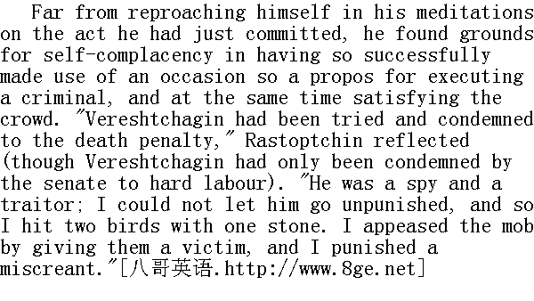 一名忠于职守的警官, 发觉尸体摆在大人院内不像话, 有碍观瞻, 命令龙骑兵把它拖到街上去。两名龙骑兵抓起打得变了形的腿, 拖走尸体。血迹斑斑, 糊满尘土, 已经僵死的细脖子上的剃了半边的脑袋, 动来动去地在地上拖着。人群挤着让开尸体。 When Vereshtchagin fell, and the crowd with a savage yell closed in and heaved about him, Rastoptchin suddenly turned white, and instead of going to the back entrance, where horses were in waiting for him, he strode rapidly along the corridor leading to the rooms of the lower story, looking on the floor and not knowing where or why he was going. The count's face was white, and he could not check the feverish twitching of his lower jaw. 在韦列夏金倒地, 人群狂叫着挤到他身旁, 前仰后翻, 东倒西歪时, 拉斯托普钦突然脸色苍白, 他不是朝着在那里等候他上马车的后门廊走去, 而是低下了头, 不由自主地沿着通往下面一层房间的走廊快步地走。他自己也不知道去什么地方, 为什么这样走, 伯爵的面容苍白, 下巴颏像害疟疾般不住停地发抖。 "Your excellency, this way ... where are you going? ... this way," said a trembling, frightened voice behind him. Count Rastoptchin was incapable of making any reply. Obediently turning, he went in the direction indicated. At the back entrance stood a carriage. The distant roar of the howling mob could be heard even there. Count Rastoptchin hurriedly got into the carriage, and bade them drive him to his house at Sokolniky beyond the town. As he drove out into Myasnitsky Street and lost the sound of the shouts of the mob, the count began to repent. He thought with dissatisfaction now of the excitement and terror he had betrayed before his subordinates. "The populace is terrible, it is hideous. They are like wolves that can only be appeased with flesh," he thought. "Count! there is one God over us!" Vereshtchagin's words suddenly recurred to him, and a disagreeable chill ran down his back. But that feeling was momentary, and Count Rastoptchin smiled contemptuously at himself. "I had other duties. The people had to be appeased. Many other victims have perished and are perishing for the public good," he thought; and he began to reflect on the social duties he had towards his family and towards the city intrusted to his care; and on himself-not as Fyodor Vassilyevitch Rastoptchin (he assumed that Fyodor Vassilyevitch Rastoptchin was sacrificing himself for le bien publique)-but as governor of Moscow, as the representative of authority intrusted with full powers by the Tsar. "If I had been simply Fyodor Vassilyevitch, my course of action might have been quite different; but I was bound to preserve both the life and the dignity of the governor."" 爵爷, 往这边......您这是往哪儿?......请这边走。"他身后一个害怕得发抖的声音说。拉斯托普钦已无力答话, 只是顺从地转过身来, 朝指给他的方向去。后门廊下停着一辆轻便马车。隔得远了的汹涌的人声, 在这里仍可听到。拉斯托普钦匆匆坐上马车, 吩咐驶往他在索科尔尼茨的郊外别墅。行至肉铺街, 再也听不到人群的哄闹声之后, 伯爵开始感到后悔。他现在懊恼地回想起他在下层面前表现出的激动和惶恐不安。"La populace est terrible, elle est hideuse, "他用法语这样想。"Ils sont comme les loups qu'on ne peut apaiser qua'vecde la chair."①"伯爵, 我们的头上有一个上帝!"他突然想起韦列夏金这句话, 一阵不愉快的寒战, 透过他的脊梁骨。但只是短暂的一瞬, 拉斯托普钦伯爵轻蔑地嘲笑了一下自己。"J'avais d'autres devoirs, "他想, "Il fallait apaiser le peuple.Bien d'autres victimes ont peri et perissent pour le bien publique."②于是, 他转而去想他所担负的责任: 对他的家庭, 对他的(即委托给他的)都城, 以及对他自己所负的责任--不是想费多尔·瓦西里耶维奇·拉斯普钦(他认为费·瓦·拉斯托普钦正为bien publique③作自我牺牲), 而是想那个作为总督, 权力的代表和沙皇的全权代表的他。"如果我仅仅是费多尔·瓦西里耶维奇, ma ligne de condnite auraite ete tout autrement tracee④, 但我应既保住生命, 又保持总督之尊严。" ①民众成群结队是可怕的, 真讨厌。他们像狼群, 除了肉, 别的东西什么也满足不了他们。 ②我有另外的职责(即安定民心--原编者注)。许多牺牲品已经并仍将为公众利益遭到灭亡。 ④我的道路将完全是另一个样子。 Lightly swayed on the soft springs of the carriage, and hearing no more of the fearful sounds of the mob, Rastoptchin was physically soothed, and as is always the case simultaneously with physical relief, his intellect supplied him with grounds for moral comfort. The thought that reassured Rastoptchin was not a new one. Ever since the world has existed and men have killed one another, a man has never committed such a crime against his fellow without consoling himself with the same idea. That idea is le bien publique, the supposed public good of others. 拉斯托普钦坐在马车柔软的弹簧座上轻轻摇晃着, 再也听不到人群可怕的叫喊, 他在生理上已趋平静, 于是又像通常那样, 随着生理上的平静, 理智也为他构想出使精神趋于平静的理由。使拉斯托普钦心地安宁的那一思想并不新鲜。自世界之存在及人们相互残杀之时日起, 任何人犯下类似的罪行时, 总是以这一思想安慰自己。这一思想便是le bien publique①, 别人的利益。 ①公众利益。 To a man not swayed by passion this good never seems certain; but a man who has committed such a crime always knows positively where that public good lies. And Rastoptchin now knew this. 对于未陷入嗜欲的人来说, 此种福利总是不可知的;但一个正在犯下罪行的人, 却