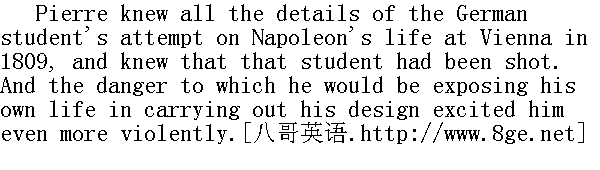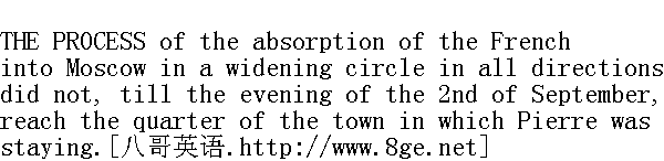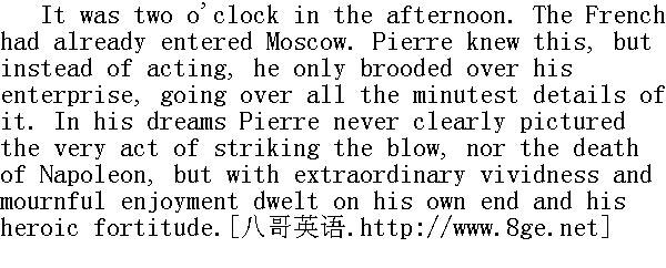 像星光四射一样在莫斯科散开来的法国人, 于九月二日傍晚才到达皮埃尔如今居住的那一地段。 After the two last days spent in solitude and exceptional conditions, Pierre was in a condition approaching madness. One haunting idea had complete possession of him. He could not have told how or when it had come to him, but that idea had now such complete possession of him that he remembered nothing in the past, and understood nothing in the present; and everything he saw and heard seemed passing in a dream. 皮埃尔离群索居, 异乎寻常地度过昨日前两天之后, 陷入近乎精神错乱的状态。他的整个身心由一种解不开的思绪支配着。他本人并不知道, 这种思绪在何时开始和怎样支配他, 但这一思绪牢牢缠住他, 以至他丝毫不记得过去, 丝毫不明白现在;而他的所见所闻有如梦境。 Pierre had left his own house simply to escape from the complicated tangle woven about him by the demands of daily life, which in his condition at that time he was incapable of unravelling. He had gone to Osip Alexyevitch's house on the pretext of sorting out the books and papers of the deceased. Simply he was in search of a quiet home of rest from the storm of life, and his memories of Osip Alexyevitch were connected in his soul with a whole world of calm, solemn, and eternal ideals, in every way the reverse of the tangled whirl of agitation into which he felt himself being drawn. He was in search of a quiet refuge, and he certainly found it in Osip Alexyevitch's study. When, in the deathlike stillness of the study, he sat with his elbows on the dusty writing-table of his deceased friend, there passed in calm and significant succession before his mental vision the impressions of the last few days, especially of the battle of Borodino, and of that overwhelming sense of his own pettiness and falsity in comparison with the truth and simplicity and force of that class of men, who were mentally referred to by him as "they." When Gerasim roused him from his reverie, the idea occurred to Pierre that he would take part in the defence of Moscow by the people, which was, he knew, expected. And with that object he had asked Gerasim to get him a peasant's coat and a pistol, and had told him that he intended to conceal his name, and to remain in Osip Alexyevitch's house. Then during the first day of solitude and idleness (Pierre tried several times in vain to fix his attention on the masonic manuscripts) there rose several times vaguely to his mind the idea that had occurred to him in the past of the cabalistic significance of his name in connection with the name of Bonaparte. But the idea that he, l'russe Besuhof, was destined to put an end to the power of the Beast, had as yet only come to him as one of those dreams that flit idly through the brain, leaving no trace behind. When after buying the peasant's coat, simply with the object of taking part in the defence of Moscow by the people, Pierre had met the Rostovs, and Natasha said to him, "You are staying? Ah, how splendid that is!" the idea had flashed into his mind that it really might be splendid, even if they did take Moscow, for him to remain, and to do what had been fore-told for him to do. 皮埃尔离开自己的家, 仅仅是回避纷繁的人生的苛求, 这一团乱麻缠住他, 在他当时的情况下又无力将它解开。他藉口清理死者的书籍和文件而到约瑟夫·阿列克谢耶维奇的府上去, 仅仅是为摆脱人生的困扰而寻找慰藉, 并且, 回忆起约瑟夫·阿列克谢耶维奇, 就会同一个充满永恒、宁静、庄严思想的世界联系起来, 这些思想与他感到自己被缠绕的令人不安的那团乱麻, 是截然不同的。他寻求一个静静的庇护所, 在约瑟夫·阿列克谢耶维奇的书斋里真的找到了。当他在书斋死一般的沉寂里, 用臂肘支撑身体靠着尘封的死者的写字台坐着时, 脑子里平静地、意味深长地闪现出一幕接一幕的近日的回忆, 尤其是波罗底诺战役的回忆, 尤其是他已铭刻在心的名为·他·们的那一类人, 与他们的真理、纯朴和实力相比, 他无可奈何地感到自己的渺小的虚假。当格拉西姆把他从沉思中唤醒时, 他想起了他要去参加预定的--如他所知的--民众保卫莫斯科的战斗。为此目的, 他请求格拉西姆给他搞一件农夫穿的长褂子和一支手枪, 并向他显露自己要隐姓埋名留在约瑟夫·阿列克谢耶维奇家里的意图。随后, 在他孤独地、无所事事地度过的第一天中(皮埃尔几次想集中注意力于共济会的手抄本, 但都未能做到), 他先前想过的关于他的名字与波拿巴的名字相关联的神秘意义, 不止一次模糊地又让他感觉到了。不过, 关于他l'Russe Besuhof①, 命定要去取消野兽的权力的想法, 只是他心驰神往的、来无踪去无影的幻想之一。 皮埃尔买到农夫穿的大褂(其目的仅在于参加民众的莫斯科保卫战)之后, 路遇罗斯托夫家里的人, 娜塔莎对他说: "您留下吗?啊, 那多好!"当时, 他脑子里闪过一个想法: 莫斯科哪怕被占领也罢, 如能留下来完成他命定该做的事, 该多好! ①俄国人别祖霍夫。 Next day with the simple aim of not sparing himself and not doing less than they would do, he had gone out to the Three Hills barrier. But when he came back, convinced that Moscow would not be defended, he suddenly felt that what had only occurred to him before as a possibility had now become something necessary and inevitable. He must remain in Moscow, concealing his name, must meet Napoleon, and kill him, so as either to perish or to put an end to the misery of all Europe, which was in Pierre's opinion entirely due to Napoleon alone. 第二天, 他怀着一个念头, 那就是不惜牺牲自己, 绝不落后于他们地走出三山关。但当他回到家里后, 确信人们