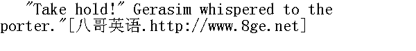 拿起武器哟!冲啊!胡说, 你夺不走!"他喊道。 "Give over, please, give over. Do me the favour, sir, please be quiet. There now, if you please, sir, ..." Gerasim was saying, cautiously trying to steer Makar Alexyevitch by his elbows towards the door." 够了, 行行好, 够了。给我们个面子, 请放下吧, 请吧, 老爷......"格拉西姆说, 小心地抓住马卡尔·阿列克谢维奇的胳膊, 用力向房门口推他。 "Who are you? Bonaparte!..." yelled Makar Alexyevitch." 你是谁?波拿巴!......"马卡尔·阿列克谢耶维奇叫着。 "That's not the thing, sir. You come into your room and rest a little. Let me have the pistol now."" 这不好, 主人家。您请到房间里去, 请休息一下, 把小手枪给我吧。" "Away, base slave! Don't touch me! Do you see?" screamed Makar Alexyevitch, brandishing the pistol. "Run them down!"" 滚, 讨厌的奴才!别碰!看见吗?"马卡尔·阿列克谢耶维奇摇晃着手枪喊道。"冲啊!"