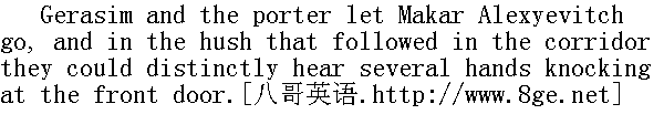 格拉西姆和看门人松手放了马卡尔·阿列克谢耶维奇, 于是, 在沉寂下来的走廊里, 清晰地听到几只手敲叩大门的声音。