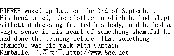 九月三日, 皮埃尔醒得很晚。他头痛, 他睡觉时不曾脱下的外套裹缠在身上使他觉得不舒服, 心里为昨晚的表现模糊地感到愧疚;这惭愧的事情就是昨晚同朗巴上尉的谈话。 His watch told him it was eleven, but it seemed a particularly dull day. Pierre stood up, rubbed his eyes, and seeing the pistol with its engraved stock-Gerasim had put it back on the writing-table-Pierre remembered where he was and what was in store for him that day 时针指到十一点, 但是户外似乎还特别晦暗。皮埃尔起床, 擦了擦眼睛, 看见格拉西姆又放在写字台上的带雕花枪托的手枪后, 想起了他在哪里, 想起了当天要做的事。 "Am I not too late already?" Pierre wondered.No, probably he would not make his entry into Moscow before twelve o'clock. Pierre did not allow himself to reflect on what lay before him, but made haste to act." 我是不是已迟到了?"皮埃尔想。"不, 大概他不会早于十二点进入莫斯科。"皮埃尔不让自己思考他要做的事, 只是要急忙去做。 Setting his clothes to rights, Pierre took up the pistol and was about to set off. But then for the first time it occurred to him to wonder how, if not in his hand, he was to carry the weapon in the street. Even under his full coat it would be hard to conceal a big pistol. It could not be put in his sash, nor under his arm, without being noticeable. Moreover, the pistol was now unloaded, and Pierre could not succeed in reloading it in time. "The dagger will do as well," Pierre said to himself; though, in considering how he should carry out his design, he had more than once decided that the great mistake made by the student in 1809 was that he had tried to kill Napoleon with a dagger. But Pierre's chief aim seemed to be, not so much to succeed in his project, as to prove to himself that he was not renouncing his design, but was doing everything to carry it out. Pierre hurriedly took the blunt, notched dagger in a green scabbard, which he had bought, together with the pistol, at the Suharev Tower, and hid it under his waistcoat. 皮埃尔整理好身上的外套, 就抓起手枪准备动身。但此时他第一次想起, 应该怎样携带武器在街上行走呢, 不能提在手上呀?即使在他那件宽大的长袍下, 也难以藏住这支大手枪。无论插在腰带里, 还是夹在胁下, 都不可能不露马腿。此外, 枪是放过的, 皮埃尔还来不及上子弹。"横竖一样, 就用匕首吧。"皮埃尔对自己说, 尽管考虑把计划付诸实施时, 他不止一次地认定, 一八○九年, 那个大学生的主要错误, 在于他想用匕首刺杀拿破仑。但是, 皮埃尔的主旨似乎不在于完成预想的事情, 而在于向自己表明, 他并未放弃自己的计划, 正在作着一切去完成它。皮埃尔急忙拿起他在苏哈列夫塔楼与手枪一起购得的匕首, 一柄装在绿色刀鞘里的有缺口的钝匕首, 把它藏在背心下面。 Tying the sash round his peasant's coat, and pulling his cap forward, Pierre walked along the corridor, trying to avoid making a noise and meeting the captain, and slipped out into the street. 皮埃尔束紧长袍, 拉低帽子, 尽量不弄出声来, 避免碰到上尉, 穿过走廊到了大街上。