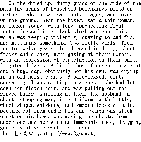 在小路一侧满是尘土的干枯的野草上, 放着一堆家什: 鸭绒被、茶炊、神像、箱子等。在地上的箱子旁边, 坐着一位已不年轻的瘦女人, 长着长长的暴牙, 身穿黑色斗篷, 戴压发帽。这女人摇晃着身子, 一面诉苦, 一面恸哭。两个小女孩, 十岁到十二岁, 各穿一身脏而嫌短的连衣裙、披小斗篷, 苍白的惊吓的脸上带着困惑不解的表情, 看着她们的母亲。一个小男孩, 约七岁, 穿一件粗呢外衣, 戴一顶别人的大帽子, 在老保姆怀里哭。一个光脚、一身很脏的使女坐在箱子上, 松开灰白的大辫子, 在揪掉烧焦的头发, 一边揪一边嗅着。丈夫, 个儿不高, 背微驼、穿普通文官制服, 留一圈络腮胡, 平整的鬓角从戴得端正的帽子下露出来, 正紧绷着脸翻动摞在一起的箱子, 从里面取出些衣服来。 The woman almost flung herself at Pierre's feet as soon as she saw him. 女人一见皮埃尔, 几乎投在他脚下。 "Merciful heavens, good Christian folk, save me, help me, kind sir! ... somebody, help me," she articulated through her sobs. "My little girl! ... My daughter! ... My youngest girl left behind! ... She's burnt! Oo ... er! What a fate I have nursed thee for ... Ooo!"" 亲爱的老爷们, 正教徒们, 救救我们, 帮助我们吧, 亲爱的!......你们谁帮帮我们吧, "她嚎啕着哀告, "小女孩!......女儿!......我的小女儿没救出来!给丢下了......她烧死了!呜呜!我白白养了你......呜呜!" "Hush, Marya Nikolaevna," the husband said in a low voice to his wife, evidently only to justify himself before an outsider." 行了, 玛丽亚·尼古拉耶夫娜, "丈夫小声对妻子说, 显然不过要在旁人面前替自己辩护, "一定是姐姐把她带走了, 否则她能到什么地方去呢!"他补充说。 "Sister must have taken her, nothing else can have happened to her!" he added." 木头人, 坏蛋!"妻子突然止住哭泣, 恶狠狠地大骂。