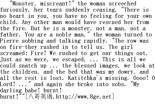 你没有心肝, 不疼自己的孩子。别人就会把她从火里救出的。这人是木头, 而不是人, 不是父亲。您是高尚的人, "她抽泣着连珠炮似地对皮埃尔说。"隔壁燃起来了, 随即向我们烧来。小姑娘喊了一声: 着火了!我们赶紧收拾东西。我们当时穿什么就是什么地逃了出来......这才抢出这么点东西......神像和陪嫁的床, 其余的一切都丢了。看看孩子们呢, 卡捷奇卡不见了。呜呜!呵, 上帝!......"她又放声大哭, "我的心肝宝贝啊, 烧死了!烧死了!" "But where, where was she left?" said Pierre.From the expression of his interested face, the woman saw that this man might help her." 在哪里呢?她到底在哪里丢失的呢?"皮埃尔问。女人从他热情洋溢的脸上看出, 他这人能帮助她。 "Good, kind sir!" she screamed, clutching at his legs. "Benefactor, set my heart at rest anyway ... Aniska, go, you slut, show the way," she bawled to the servant-girl, opening her mouth wide in her anger, and displaying her long teeth more than ever." 老爷!我的亲爹!"她抱住他的腿呼喊, "恩人啊, 这下我放心了......阿尼斯卡, 去带路, 死东西。"她向使女大声呼叫, 生气地张着嘴, 这就更加露出了她的长门牙。 "Show the way, show me, I ... I ... I'll do something," Pierre gasped hurriedly." 带路, 带路, 我......我......我办得到。"皮埃尔喘着气急忙说。 The dirty servant-girl came out from behind the box, put up her hair, and sighing, walked on in front along the path with her coarse, bare feet. 一身很脏的使女从箱子后面走出来, 束好发辫, 叹了一口气后, 赤足笨拙地沿小路走在前面。