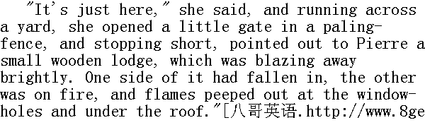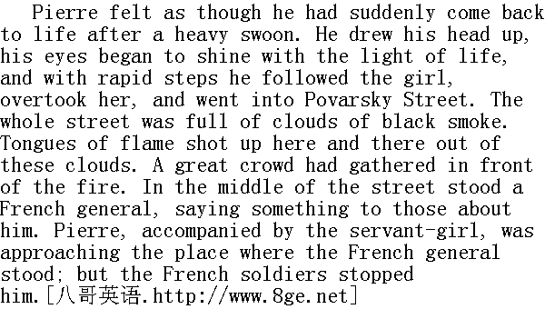 皮埃尔仿佛突然从深沉的昏厥中复苏。他更高地昂起头, 眼睛里闪耀出生命的光辉, 快步地跟随这姑娘而去, 赶上了她, 走出小路到了波瓦尔大街。满街飘起一团团乌云般的黑烟, 有些地方的黑烟里冒出火舌。人们在大火前挤作一团。街心站着一名法国将军, 对周围的人讲话。由使女带路的皮埃尔已经走到了将军站的位置附近, 但法国士兵挡住他。 "Can't pass," a voice shouted to him. "On ne passe pas, "①一个声音向他喊话。 ①此处不通行。 "This way, master," bawled the girl. "We'll cut across Nikoliny by the lane."Pierre turned back, breaking into a run now and then to keep pace with her. The girl ran across the street, turned into a lane on the left, and passing three houses, turned in at a gate on the right." 走这边, 叔叔!"使女叫道。"我们穿过小巷, 从尼库林街穿过去。"皮埃尔转过身来往回走, 时时要跳动几下, 方能跑得上她。这姑娘跑过街去, 向左拐进一条横巷, 经过三幢房屋, 向右拐进了一家大门。