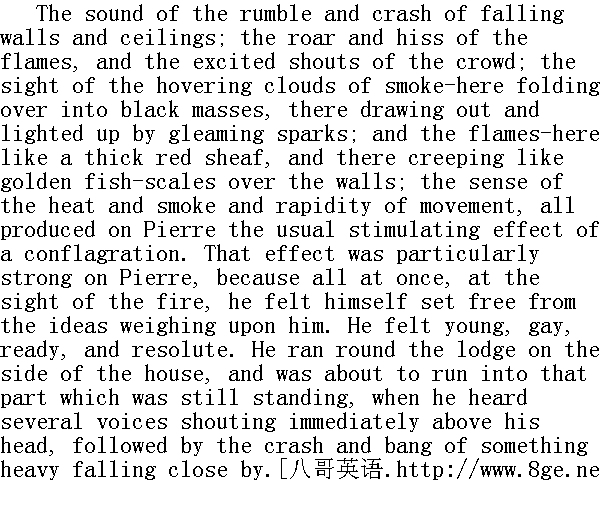 墙壁和天花板的断裂声、訇然倒塌声、火焰的呼啸和毕剥声、人们的狂叫呐喊, 时而动荡不完的烟云--时而腾空升起, 夹杂着明亮的火星, 虽烟滚滚闪出道道火光, 此处是禾捆状的通红的火柱, 彼处是沿着墙蔓延的鱼鳞状的金色火焰--这一切景象, 合着热浪和烟味的刺激, 行动的迅速, 这种种感觉在皮埃尔身上产生了面对火灾常有的兴奋作用。这种作用力特别强烈, 则是因为皮埃尔看见这场大火, 突然体验到那种从折磨他的思想中解脱的感觉。他觉得自己年轻、愉快、灵活和果断。他从这座房子的一边绕到耳旁后面, 正要跑进还没倒塌的部分, 这时, 他的头顶有几个人在大喊, 随后听见哗啦啦的响声, 一件笨重的东西砰然一声落在他的脚下。 Pierre looked round, and saw at the windows of the house some French soldiers, who had just dropped out a drawer of a chest, filled with some metallic objects. Some more French soldiers standing below went up to the drawer. 皮埃尔回头一看, 见到窗户里的几个法国人, 他们把一个橱柜的抽屉摔了下来, 里面盛满一些金属器皿。另一些站在下面的士兵走近这只抽屉。 "Well, what does that fellow want?" one of the French soldiers shouted, referring to Pierre. "Eh bien, qu'est ce qu'il veut celui-la."①法国兵中的一个朝皮埃尔喊。 ①这人要干什么?