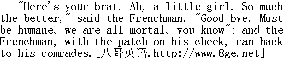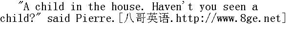 "Un enfant dans cette maison.N'avez vous pas vu un enfant?"②皮埃尔说。 ②这屋里有一个小孩。你们没看见小孩吗? "What's the fellow singing? Get along, do!" shouted voices; and one of the soldiers, evidently afraid Pierre might take it into his head to snatch the silver and bronzes from them, pounced on him in a menacing fashion. "Tiens, qu'est ce qu'il chante celui-la?Va te pro-mener."③上面几个人说, 而士兵中的一个, 显然害怕皮埃尔想起向他们夺取抽屉里的银铜器皿, 气势汹汹地逼近他。 "A child?" shouted a Frenchman from above. "I did hear something crying in the garden. Perhaps it's the fellow's brat. Must be humane you know.""Where is it?" asked Pierre. "Un enfant?"上面一个法国人喊道, "j'ai entendu piailler quelque chose au jardin.Peut-eAtre c'est son moutard au bonhomme.Faut eAtre humain, voyez vous......""Ou est-il?Ou est-il?"①皮埃尔问。 ①小孩?我听到有个东西在花园里嘤嘤地哭。可能是他的小孩。好吧, 应该实行人道。我们都是人......"在那儿?在哪儿?" "This way!" the French soldier shouted to him from the window pointing to the garden behind the house. "Wait, I'll come down."