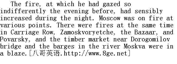 他头天晚上漠然看着的那场大火, 一夜之间大大地蔓延开来。莫斯科四面八方都在燃烧。同时烧起来的有马车市场、莫斯科河外区、商场、波瓦尔大街、莫斯科河上的驳船和多罗戈米洛夫桥旁的木材市场。 Pierre's way lay across a side street to Povarsky, and from there across Arbaty to the chapel of Nikola Yavlenny, where he had long before in his fancy fixed on the spot at which the deed ought to be done. Most of the houses had their gates and shutters closed. The streets and lanes were deserted; there was a smell of burning and smoke in the air. Now and then he met Russians with uneasy and timid faces, and Frenchmen with a look of the camp about them, walking in the middle of the road. Both looked at Pierre with surprise. Apart from his great height and stoutness, and the look of gloomy concentration and suffering in his face and whole figure, Russians stared at Pierre because they could not make out to what class he belonged. Frenchmen looked after him with surprise, because, while all other Russians stared timidly and inquisitively at them, Pierre walked by without noticing them. At the gates of a house, three Frenchmen, disputing about something with some Russians, who did not understand their meaning, stopped Pierre to ask whether he knew French. 皮埃尔的路线要经过几条小巷到波瓦尔大街, 再到阿尔巴特街上的圣尼古拉教堂, 他老早就在其附近设想好一个地点, 他的计划就要在那个地点完成。大部分房屋的门窗都已紧闭。大街小巷空寂无人。空气里弥漫着焦糊和烟熏的气味。间或碰到一些神色惊惶不安的俄国人, 和走在街心的一付乡下佬和丘八模样的法国人。俄国人和法国佬都惊奇地看皮埃尔。俄国人注视他, 除了他那个子高而胖, 除了他脸上和全身上下显出古怪、阴沉、神情专注和愁苦的样子之外, 还由于分辨不清这人属于何种阶层。法国佬惊奇地目送着皮埃尔, 特别是因为, 皮埃尔与又怕又好奇地望着法国人的普通俄国人相反, 他对法国人根本不屑一顾。在一幢房子的大门口, 三名法国人在与听不懂他们话的俄国人交涉着什么事, 他们拦住皮埃尔, 问他懂不懂法语。 Pierre shook his head and walked on. In another lane a sentinel, on guard by a green caisson, shouted at him, and it was only at the repetition of his menacing shout, and the sound of his picking up his gun, that Pierre grasped that he ought to have passed the street on the other side. He heard and saw nothing around him. With haste and horror he bore within him his intention as something strange and fearful to him, fearing-from the experience of the previous night-to lose it. But Pierre was not destined to carry his design in safety to the spot to which he was bending his steps. Moreover, if he had not been detained on the road, his design could not have been carried out, because Napoleon had four hours earlier left the Dorogomilov suburb, and crossed Arbaty to the Kremlin; and he was by then sitting in the royal study in the Kremlin palace in the gloomiest temper, giving circumstantial orders for immediately extinguishing the fires, preventing pillage, and reassuring the inhabitants. But Pierre knew nothing of that; entirely engrossed in what lay before him, he was suffering the anguish men suffer when they persist in undertaking a task impossible for them-not from its inherent difficulties, but from its incompatibility with their own nature. He was tortured by the dread that he would be weak at the decisive moment, and so would lose his respect for himself. 皮埃尔否定地一摇头, 又向前走了。在另一条巷子里, 守在绿色弹药箱旁的哨兵对他吆喝一声, 而皮埃尔只在听到第二次厉声吆喝和哨兵手上的武器弄响以后, 方才明白, 他得绕到旁边一条街。他对周围的一切既听不见也看不见。他像带着一样可怕的生人的物件, 以急迫和恐怖感怀揣自己的计算, 生活--昨晚的经验教训了他--把计划给弄丢了。但是, 皮埃尔注定不能把自己的情绪完整地维持到他正奔向的地点。而且, 即使他不在路上受阻, 他的计划也已无从实现, 因为四个多小时以前, 拿破仑就已从多罗戈米洛夫郊区, 经阿尔巴特街进入克里姆林宫, 这时, 情绪极为阴沉, 正坐在克里姆林宫的沙皇办公室内, 发布关于立即扑灭大火、禁止抢劫、安定民心的详细而严厉的命令。但皮埃尔是不知道的;他专心致志于自己的事, 仍然在受折磨, 像执着于知其不可而为之的人们那样受折磨--不是由于重重困难, 而是由于天生的其事不当;他受折磨是因为害怕在决定关头软下来, 因而失去自尊心。 Though he saw and heard nothing around him, he instinctively found his way, and took the right turning to reach Povarsky. 虽然他看不见也听不见周围的一切, 仍凭本能辨明道路, 并准确无误地穿过几条小巷子, 这些小巷子把他带到了阿瓦尔大街。 As Pierre got nearer to Povarsky Street, the smoke grew thicker and thicker, and the air was positively warm from the heat of the conflagration. Tongues of flame shot up here and there behind the house-tops. He met more people in the streets, and these people were in great excitement. But though Pierre felt that something unusual was happening around him, he did not grasp the fact that he was getting near the fire. As he walked along a path, across the large open space adjoining on one side Povarsky Street, and on the other side the gardens of Prince Gruzinsky, Pierre suddenly heard close by him the sound of a woman, crying desperately. He stood still, as though awakened from a dream, and raised his head. 随着皮埃尔愈益走近波瓦尔大街, 大烟愈来愈浓, 大火甚至使这儿的空气变得暖和。间或可以看见巨大的火舌, 在屋