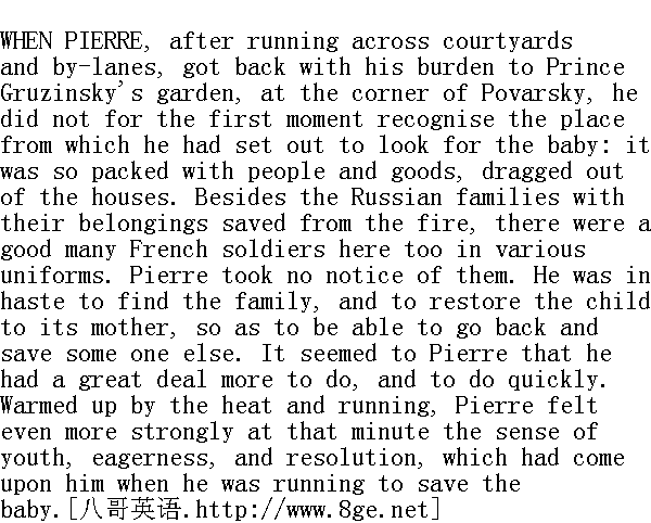 当皮埃尔跑过几家院子几条小巷, 携带着女孩回到波瓦尔大街街角的格鲁津斯基花园时, 他一下子还没认出他刚才离开去找小孩的这个地方: 这儿阻塞着许多人和从房屋里拖出来的家什。除开逃出火灾来到这里的带着财物的几个俄罗斯家庭之外, 这里还有一些身穿各色各样服装的法国士兵。皮埃尔并不注意这些人。他急于要找到那个小官一家人, 好把女儿交给母亲, 然后再去救别的人。皮埃尔觉得他还须赶快做许多事。热气和奔跑使得浑身发热的皮埃尔, 此时体验到一股充满青春、活力和坚决劲儿, 比他跑去救小孩时所感受到的更强烈。 The child was quiet now, and clinging to Pierre's coat with her little hands, she sat on his arm, and looked about her like a little wild beast. Pierre glanced at her now and then, and smiled slightly. He fancied he saw something touchingly innocent in the frightened, sickly little face. 小姑娘现在安静了, 用小手抓紧皮埃尔的长袍, 坐在他臂弯上, 像一头小野兽似的, 张望着她的周围。皮埃尔不时地看看她, 微微地笑着。他仿佛在这张吓坏了的病恹恹的脸上, 看到使他感动的无辜的受难者的样子。 Neither the official nor his wife were in the place where he had left them. With rapid steps, Pierre walked about among the crowd, scanning the different faces he came across. He could not help noticing a Georgian or Armenian family, consisting of a very old man, of a handsome Oriental cast of face, dressed in a new cloth-faced sheepskin and new boots; an old woman of a similar type; and a young woman. The latter-a very young woman-struck Pierre as a perfect example of Oriental beauty, with her sharply marked, arched, black eyebrows, her extraordinarily soft, bright colour and beautiful, expressionless, oval face. Among the goods flung down in the crowd in the grass space, in her rich satin mantle, and the bright lilac kerchief on her head, she suggested a tender, tropical plant, thrown down in the snow. She was sitting on the baggage a little behind the old woman, and her big, black, long-shaped eyes, with their long lashes, were fixed immovably on the ground. Evidently she was aware of her beauty, and fearful because of it. Her face struck Pierre, and in his haste he looked round at her several times as he passed along by the fence. Reaching the fence, and still failing to find the people he was looking for, Pierre stood still and looked round. 在原来的地方, 小官不在, 他的妻子也不在了。皮埃尔在人堆里快步穿行, 瞧他碰到的各种面孔。他无意地注意到了一个格鲁吉亚人或阿尔明尼亚人的家庭, 这个家庭是由一个年高的长者(漂亮的东方脸型, 穿一件新皮袄和一双新靴子)、一个同样脸型的老太太和一个年轻女郎所组成的。这个很年轻的女郎照皮埃尔看来, 是东方美人的完美体现, 她长着轮廓呈弓形的浓黑的秀眉, 一张长长的毫无表情的、却异常柔媚的红脸蛋。在这块空地上的人堆里散乱放着的什物中间, 披一件豪华的缎面斗篷式的长衫, 扎一条浅紫色头巾, 像一株娇嫩的温室里植物被抛在雪地上。她坐在老太太身后不远的包袱上, 用又黑又大的睫毛长长的杏眼动不动地看着地面。显然, 她知道自己的美貌, 为美貌而耽心。这容貌使皮埃尔惊叹, 当他在匆忙中, 在进入栅栏以后, 他还频频回头看她。虽然来到栅栏附近, 他仍找不到要找的人。皮埃尔停下, 往四下里看。 Pierre's figure was more remarkable than ever now with the baby in his arms, and several Russians, both men and women, gathered about him. 皮埃尔手里抱着小女孩的模样, 比先前更为引人注目, 他周围聚扰了几个俄国人, 有男有女。