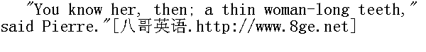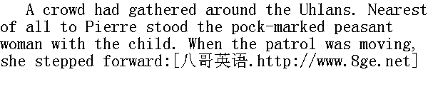 枪骑兵周围聚起了人群。离皮埃尔最近的是带着小女孩的麻脸姆妈;当巡逻队走动起来, 她往前挪动了几步。 "Why, where are they taking you, my good soul?" she said. "The child! what am I to do with the child if it's not theirs?" she cried." 这是要把你往哪里带呢, 我亲爱的?"她说, "小姑娘呢, 小姑娘我往哪儿搁呢, 如果她不是他们家的!"她不断地说。 "What does she want, this woman?" asked the officer. "Qu'est ce qu'elle veut, cette femme."⑤军官问道。 ⑤她要干什么?