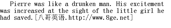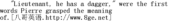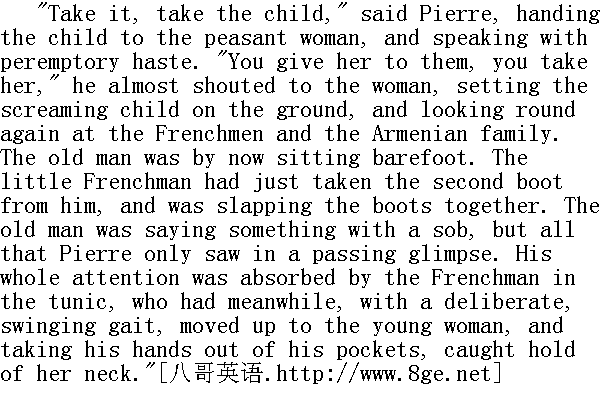 接着, 接着小孩, "皮埃尔边说边把小孩递给姆妈, 并用命令口吻匆忙对她说, "你交给他们, 交给他们!"他几乎是在对姆妈喊叫, 把又哭起来了的小姑娘往地上一放, 又再回过头去看法国兵和阿尔明尼亚的那家人。长者已是光脚坐在那里。矮小的法国兵脱下他的第二支靴子, 在用一只拍打另一只。长者呜咽地诉说着什么, 但是皮埃尔只是瞥了一眼, 他的全部注意力此时集中在穿女外衣的法国兵身上, 这家伙慢慢地摇头晃脑地走近年轻女郎之后, 把手从裤包里伸出来, 抓住了她的脖子。 The beautiful Armenian still sat in the same immobile pose, with her long lashes drooping, and seemed not to see and not to feel what the soldier was doing to her. 阿尔明尼亚美人继续坐着不动, 仍像刚才的样子, 长长的睫毛下垂, 仿佛没看见也没感觉到这个兵在对她干什么。 While Pierre ran the few steps that separated him from the Frenchman, the long soldier in the tunic had already torn the necklace from the Armenian beauty's neck, and the young woman, clutching at her neck with both hands, screamed shrilly. 皮埃尔从几步之外跑到法国兵跟前时, 穿女外衣的瘦高个子的劫匪已从阿尔明尼亚女郎脖子上扯下她佩戴的项链, 而年轻女郎用手抱着脖子尖声地叫着。 "Let that woman alone!" Pierre roared in a voice hoarse with rage, and seizing the long, stooping soldier by the shoulders he shoved him away. The soldier fell down, got up, and ran away. His comrade, dropping the boots, pulled out his sword, and moved up to Pierre in a menacing attitude. "Laissez cette femme!"①皮埃尔用狂怒的嘶哑的嗓音大叫, 抓住高个子驼背的士兵的肩膀, 把他扔到一边去。那个兵跌到了, 爬起来之后连忙跑开。但他的同伙, 扔掉靴子, 拔出佩刀向皮埃尔气势汹汹地逼过来。 "Voyons, pas de betises!" he shouted. "Voyons, pas de betises!"②他叫了一声。 ②喂, 喂!别胡闹! Pierre was in that transport of frenzy in which he remembered nothing, and his strength was increased tenfold. He dashed at the barefoot Frenchman, and before he had time to draw his cutlass, he knocked him down, and was pommelling him with his fists Shouts of approval were heard from the crowd around, and at the same time a patrol of French Uhlans came riding round the corner. The Uhlans trotted up to Pierre, and the French soldiers surrounded him. Pierre had no recollection of what followed. He remembered that he beat somebody, and was beaten, and that in the end he found that his hands were tied, that a group of French soldiers were standing round him, ransacking his clothes. 皮埃尔处于愤怒的顶点, 这样子他什么都不记得了, 而且力量增加了十倍。他在光脚的法国兵还未抽出佩刀前, 就扑了过去把他打倒在地, 用拳头捶他。围观的群众响起一片赞许声, 正在这时, 一队法国枪骑兵巡逻队在街角出现。枪骑兵驰到皮埃尔和法国兵跟前, 把他俩包围住。以后的事, 皮埃尔便什么也不记得了。他记得他打了人, 也挨了打, 最后, 他感觉出他的手被绑起来, 一群法国兵围着他站着, 搜他的衣裳。