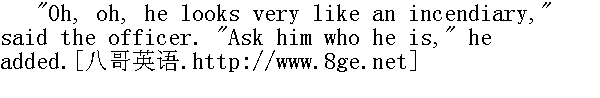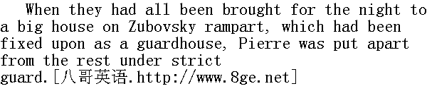 "Oh, oh!ca m'a bien l'air d'un des incendiBaires, "军官说。"Demandez lui ce qu'il est?"②他又说。 ②噢, 噢!他很像纵火犯。问他, 他是谁? "Who are you?" asked the interpreter in his Frenchified Russian. "You must answer the officer."" 你是谁?"翻译问, "你得回答长官。"他说。 "I will not say who I am. I am your prisoner. Take me away." Pierre said suddenly in French. ③我不告诉你们我是谁。我是你们的俘虏。带我走。 "Ah! ah!" commented the officer, knitting his brows; "well, march then!" "Ah!Ah!" 军官皱起眉头说。"Marchons!"④ ④啊!啊!齐步走!