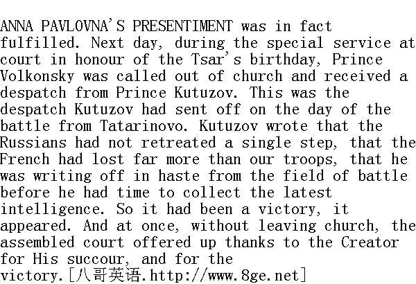 安娜·帕夫洛夫娜的预感的确证实了。次日, 在宫中为皇帝祝寿而举行祈祷仪式的过程中, 沃尔孔斯基公爵被叫出教堂, 收到库图佐夫公爵的一封信。这是库图佐夫在战斗的当天以塔塔里诺沃送来的快报。库图佐夫写道, 俄军一步也未后退, 法军损失大大超过我方, 这是他在战地仓卒呈报的, 还未来得及汇总最后的情报。看来, 这是一场胜利之战。于是, 即时即地, 就在教堂, 为了造物主的帮助, 也为了这次胜利, 对造物主表示了感谢。 Anna Pavlovna's presentiment had been fulfilled, and the whole morning a mood of joyous festivity prevailed in the town. Every one accepted the victory as a conclusive one, and some people were already beginning to talk of Napoleon's having been taken prisoner, of his disposition, and the selection of a new sovereign for France 安娜·帕夫洛夫娜的预感证实了, 因而, 城里边整个上午都流露着欢乐的节日的情绪。大家都认为这是一次胜利, 一些人已在议论俘获拿破仑本人, 谈话废黜他和为法军择立新主之事。 At a distance from the scene of action and amid the conditions of court life, it is very difficult for events to be reflected in their true force and dimensions. Public events are involuntarily grouped about some private incident. So in this case, the courtiers' rejoicing was as much due to the fact of the news of this victory having arrived precisely on the Tsar's birthday as to the fact of the victory itself. It was like a successfully arranged surprise. Kutuzov's despatches had spoken, too, of the Russian losses, and among them had mentioned the names of Tutchkov, Bagration, and Kutaissov. The melancholy side, too, of the event was unconsciously in this Petersburg world concentrated about a single incident-the death of Kutaissov. Every one knew him, the Tsar liked him, he was young and interesting. All met that day with the words: 远离战场, 而且又在宫廷生活的环境中, 是很难作到使事件的全部真相和影响力都反映出来的。一般事件围绕某一个别情事不知不觉地相继发生, 现在正是这样, 大快朝臣之心的事, 既在于我们赢得胜利, 亦在于胜利的消息正与皇上寿辰巧合。这是绝妙的一桩意外喜事。库图佐夫的报告也谈了俄军的损失, 其中列举出图奇科夫、巴格拉季翁、库泰索夫等人。这种悲惨的事件围绕着库泰索夫阵亡一事, 在彼得堡这个地区也不知不觉地发生了。大家都认识他, 陛下宠爱他, 他又年轻又有趣。这一天, 大家见面时都说: "How wonderful it should have happened so! Just in the Te Deum. But what a loss-Kutaissov! Ah, what a pity!"" 多么叫人吃惊。正碰上祈祷。库泰索夫的损失太大了!唉, 多么遗憾!" "What did I tell you about Kutuzov?" Prince Vassily said now with the pride of a prophet. "I always said he was the only man capable of conquering Napoleon."" 我对你们说过库图佐夫吗?"瓦西里公爵现在以预言家的骄傲神情说。"我从来都说, 只有他才能战胜拿破仑。"
