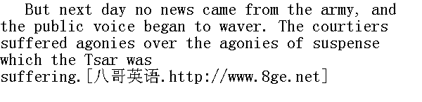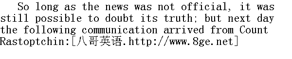 但是, 第二天没得到军队的消息, 大家的语声都显得不安起来。朝臣们苦恼的是皇上得不到消息, 因而感到难受。 "Think of the Emperor's position!" the courtiers said; and they no longer sang the praises of Kutuzov as two days before, but upbraided him as the cause of the Tsar's uneasiness that day. Prince Vassily no longer boasted of his protege Kutuzov, but was mute when the commander-in-chief was the subject of conversation. Moreover, on the evening of that day everything seemed to conspire to throw the Peters-burg world into agitation and uneasiness: a terrible piece of news came to add to their alarms. Countess Elena Bezuhov died quite suddenly of the terrible illness which had been so amusing to talk about. At larger gatherings every one repeated the official story that Countess Bezuhov had died of a terrible attack of angina pectoris, but in intimate circles people told in detail how the Queen of Spain's own medical attendant had prescribed to Ellen small doses of a certain drug to bring about certain desired results; but that Ellen, tortured by the old count's suspecting her, and by her husband's not having answered her letter (that unfortunate, dissipated Pierre), had suddenly taken an enormous dose of the drug prescribed, and had died in agonies before assistance could be given. The story ran that Prince Vassily and the old count had been going to take proceedings against the Italian; but the latter had produced notes in his possession from the unhappy deceased of such a character that they had promptly let him go." 皇上的情况会怎样啊!"朝臣们说, 而且不再像两天前那样赞扬库图佐夫, 他们谴责他成了皇上不安之源。瓦西里公爵在这天已不再称赞他所protege(赏识的)库图佐夫, 而当人们谈起总司令时, 只保持沉默。不仅如此, 当天傍晚, 仿佛有意要使彼得堡居民惊慌不安似的, 事情都凑到一块儿了: 又有一条可怕的消息来赶热闹。海伦·别祖霍娃伯爵夫人突然死于人们曾经那么饶有兴趣地谈论过的可怕的病症。在稠人广众的交际场所, 大家都一本正经地说别祖霍娃伯爵夫人死于anginepectorole(可怕的心绞痛)发作, 但在亲密的圈子里, 人们却详尽地谈到lemedecinintimedelareined'EsBpagne(那个西班牙皇后的私人医生), 说他给海伦开了剂量不大作用不详的某种药物;但是海伦受到老伯爵猜疑, 她丈夫(那个倒霉的浪荡的皮埃尔)不给她回信, 因此十分痛苦, 她忽然大剂量地服用了开给她的那种药, 在人们起来抢救之前便痛苦地死去了。他们说, 瓦西里公爵和老伯爵本想追究那个意大利人, 但是意大利人拿出几封不幸的死者的手札, 他们当即放过了他。 Conversation centred round three melancholy facts-the Tsar's state of suspense, the loss of Kutaissov, and the death of Ellen. 众人的谈话集中在三大令人悲哀的事情上: 皇上不明战况, 库泰索夫阵亡和海伦之死。 On the third day after Kutuzov's despatch, a country gentleman arrived in Petersburg from Moscow, and the news of the surrender of Moscow to the French was all over the town. This was awful! Think of the position of the Emperor! Kutuzov was a traitor, and during the "visits of condolence" paid to Prince Vassily on the occasion of his daughter's death, when he spoke of Kutuzov, whose praises he had once sung so loudly-it was pardonable in his grief to forget what he had said before-he said that nothing else was to be expected from a blind and dissolute old man. 在收到库图佐夫报告的第三天, 莫斯科一位乡绅抵达彼得堡, 于是, 全城传遍了莫斯科拱手让给法国人的消息。这太可怕了!皇上的处境会怎么样啊!库图佐夫是叛徒, 而瓦西里公爵在接受宾客对他女儿亡故进行的visitesde condoleance(吊问)时, 讲起先前受他赞扬的库图佐夫(应该原谅他在悲痛中忘掉了他先前说过的话)时说, 不可能向一个瞎眼浪荡的老头子指望别的什么。 "I only wonder how such a man could possibly be trusted with the fate of Russia."" 我只有感到吃惊, 怎么可以把俄国的命运交给这样一个人。"