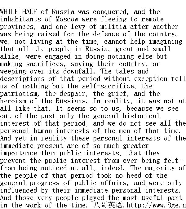 在俄国一半国土被占领, 莫斯科居民逃往边远省份, 各地民团相继起来保卫祖国的时候, 我们这些并非生长于那一时代的人们, 会自然而然地设想, 全体俄国民众, 从大人到小孩, 都一心想牺牲自己、拯救祖国、或痛哭祖国的沦陷。关于那一时代的故事和记载莫能例外地只讲讲牺牲精神, 爱国热情, 失望, 痛苦, 和英勇行为。但实际上并非如此。事情照我们看来之所以是那个样子, 仅由于我们从已发生的事情当中, 看到的只是对那一时代总的历史兴趣, 而未看到所有人们具有的个人的兴趣。然而实际上呢, 那些属于个人眼前的兴趣大大超过共同的兴趣, 以至有时感觉不到(甚至毫不察觉)共同的兴趣。那时的大多数民众, 丝毫不注意历史的总的进程, 只以每个人眼前的个人兴趣为准则。而这些民众正是那一时代最有用的活动家们。 Those who were striving to grasp the general course of events, and trying by self-sacrifice and heroism to take a hand in it, were the most useless members of society; they saw everything upside down, and all that they did with the best intentions turned out to be useless folly, like Pierre's regiment, and Mamonov's, that spent their time pillaging the Russian villages, like the lint scraped by the ladies, that never reached the wounded, and so on. Even those who, being fond of talking on intellectual subjects and expressing their feelings, discussed the position of Russia, unconsciously imported into their talk a shade of hypocrisy or falsity or else of useless fault-finding and bitterness against persons, whom they blamed for what could be nobody's fault. 那些试图理解天下大事所趋, 并想以自我牺牲和英勇作战行为去参与天下大事的人们, 是社会中最无用的成员;他们看到的一切是颠倒的, 他们为公益所做的一切到头来都是无益的胡闹, 就像皮埃尔兵团和马莫诺夫兵团①抢劫俄国的农村, 后方太太小姐撕布抽纱卷成的棉线团永远到不了伤员那里等等。甚至爱卖弄聪明、表露感情的人, 一议论俄国局势时, 也会不自觉地在言谈中带有虚伪和撒谎的痕迹, 或者无益于事地指责和痛恨某些不能任其咎的人们。 ①指由这两人捐助而成立的两个兵团。 In historical events we see more plainly than ever the law that forbids us to taste of the fruit of the Tree of Knowledge. It is only unselfconscious activity that bears fruit, and the man who plays a part in an historical drama never understands its significance. If he strives to comprehend it, he is stricken with barrenness 在历史事件中, 最明显不过的是禁止偷尝智慧之果。只有无心插柳, 方能带来一片绿荫, 而在历史事件中扮演主角的人, 永远不能明了个中的涵义。如果他试图去理解, 他会遭到劳而无功的失败。 The significance of the drama taking place in Russia at that time was the less easy to grasp, the closer the share a man was taking in it. In Petersburg, and in the provinces remote from Moscow, ladies and gentlemen in volunteer uniforms bewailed the fate of Russia and the ancient capital, and talked of self-sacrifice, and so on. But in the army, which had retreated behind Moscow, men scarcely talked or thought at all about Moscow, and, gazing at the burning city, no one swore to be avenged on the French, but every one was thinking of the next quarter's pay due to him, of the next halting-place, of Matryoshka the canteen-woman, and so on. 与这时在俄国发生的事件愈是密切有关的人, 便愈难察觉其意义。在彼得堡和远离莫斯科的一些省份, 妇女和穿义勇军制服的男人为俄国及其古都而哭泣, 声称不惜牺牲等等;但在放弃了莫斯科的军队里面, 则几乎没有人谈论, 也没有人思念莫斯科, 而在望着它那一片大火时, 谁也不起誓向法国人复仇, 却想着下一旬的军饷, 下一个宿誓地, 随军女商贩玛特廖什卡诸如此类的事情......