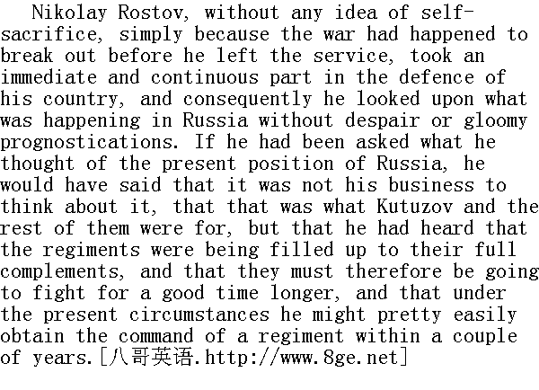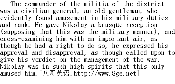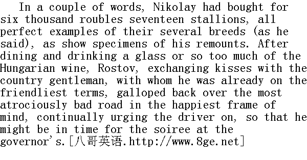 民团长官是文职将军, 一个老头子, 显然很得意于自己的军阶和官职。他生气地(以为这是军人本色)接见了尼古拉, 意味深长地盘问了尼古拉, 好似他有权这样做又以为是在审议大局。尼古拉很高兴, 只觉得这使他很开心 From the commander of militia, he went to the governor's. The governor was a brisk little man, very affable and unpretentious. He mentioned to Nikolay the stud-farms, where he might obtain horses, recommended him to a horse-dealer in the town, and a gentleman living twenty versts from the town, who had the best horses, and promised him every assistance. 他从民团长官那里直接去见省长, 省长是一位矮小而活跃的人, 十分温良和纯朴。他告诉尼古拉一些可以搞到马匹的养马场, 介绍他去找一位城里的马贩子和离城二十俄里的一位地主(他们都有良种马), 并允诺尽力协助。 "You are Count Ilya Andreitch's son? My wife was a great friend of your mamma's. We receive on Thursdays: to-day is Thursday, pray come in, quite without ceremony," said the governor, as he took leave of him." 您是伊利亚·安德烈耶维奇伯爵的公子?我妻子同您的妈妈很要好的呢。每逢星期四我家有聚会;今天就是星期四, 请不拘礼节地前来赏光。"省长和他告辞时说。 Nikolay took a posting carriage, and making his quartermaster get in beside him, galloped straight off from the governor's to the gentleman with the stud of fine horses twenty versts away.During the early days of his stay in Voronezh, everything seemed easy and pleasant to Nikolay, and, as is always the case, when a man is himself in a happy frame of mind, everything went well and prospered with him. 一离开省长那里, 尼古拉随即雇了一辆驿车, 带上司务长乘车直奔二十俄里外的地主养马场。当这初来乍到沃罗涅日的这段时间, 尼古拉是轻松愉快的, 一个人心情好时, 一切都称心如意。 The country gentleman turned out to be an old cavalry officer, a bachelor, a great horse-fancier, a sportsman, and the owner of a smoking-room, of hundred-year-old herb-brandy, of some old Hungarian wine, and of superb horses. 尼古拉要去找的那位地主是一个老单身汉, 当过骑兵, 又是养马内行和猎手, 他有一间吸烟室, 窖藏百年果酒和匈牙利葡萄酒, 拥有稀有品种的马匹。