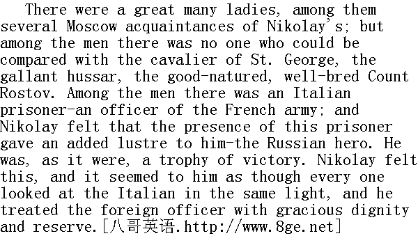 那里有许多太太小姐, 也有几个尼古拉的莫斯科的相识;但是, 能同佩戴圣乔治勋章的骑士、骠骑兵、采购马匹的军官、性格好、教养也好的罗斯托夫伯爵相匹敌的男人, 却一个也没有。在男人们中间, 有一个被俘的意大利人, 是法军的军官, 尼古拉因而觉得, 这位俘虏的在场更提高了他作为俄国英雄的地位。那个意大利人宛如一种战利品。尼古拉有此感觉, 同时在他看来, 人人也都是这样看待那个意大利人, 所以, 尼古拉以尊严和矜持的态度照顾着他。 As soon as Nikolay came in in his full-dress uniform of an officer of hussars, diffusing a fragrance of scent and wine about him, and said himself and heard several times said to him, the words, "Better late than never," people clustered round him. All eyes were turned on him, and he felt at once that he had stepped into a position that just suited him in a provincial town-a position always agreeable, but now after his long privation of such gratifications, intoxicatingly delightful-that of a universal favourite. Not only at the posting-stations, at the taverns, and in the smoking-room of the horse-breeding gentleman, had he found servant-girls flattered by his attention, but here, at the governor's assembly, there were (so it seemed to Nikolay) an inexhaustible multitude of young married ladies and pretty girls, who were only waiting with impatience for him to notice them. The ladies and the young girls flirted with him, and the old people began even from this first evening bestirring themselves to try and get this gallant young rake of an hussar married and settled down. Among the latter was the governor's wife herself, who received Rostov as though he were a near kinsman, and called him "Nikolay." 身着骠骑兵制服, 周身散发出香水和酒的气味的尼古拉, 一走进来便说了一句, 并且也听到别人对他说了几遍"vautmieusxtardquejamais"(迟到比不到好), 之后便被包围起来;所有的目光都朝向他, 使他立即感受到他已进入他在那一省的适当地位--那向来愉快的, 如今又在经过长期困苦生活之后陶醉于满足之中的, 众人宠爱的地位。不仅在驿站、旅馆和那地主的吸烟室里有贪图他垂照的女仆;而且在这里, 在省长的晚会上, 也有(尼古拉觉得是那样)数不清的年轻女士和姣好的姑娘急不可耐地等着尼古拉的青睐。女士和姑娘们同他调情, 老年人从见到他的第一天起, 便张罗着使这位骠骑兵青年浪子完婚和安家立业, 使他变得稳重起来, 这些人中, 便有省长夫人本身, 她把罗斯托夫当成自己的近亲, 用"尼古拉"和"你"称呼他。(尼古拉用的是法语Nicolas) Katerina Petrovna did in fact proceed to play waltzes and ecossaises, and dancing began, in which Nikolay fascinated the company more than ever by his elegance. He surprised every one indeed by his peculiarly free and easy style in dancing. Nikolay was a little surprised himself at his own style of dancing at that soiree. He had never danced in that manner at Moscow, and would indeed have regarded such an extremely free and easy manner of dancing as not correct, as bad style; but here he felt it incumbent on him to astonish them all by something extraordinary, something that they would be sure to take for the usual thing in the capital, though new to them in the provinces. 卡捷琳娜·彼得罗夫娜果然弹起华尔兹和苏格兰舞曲, 跳舞也就开始了, 尼古拉在跳舞中的灵活, 更使这个外省社会着迷。他那独特不拘的舞姿甚至使大家吃惊。尼古拉本人对自己这天晚上的舞风也有些惊讶。他在莫斯科从未这样跳过舞, 他甚至认为这样过于随便的姿势是无礼的, 是mauvaisgenre(坏样子);但在这里, 他感到必须用一种非同寻常的花样使本地人士吓一大跳, 即是一种在新老首都被他们视为寻常的, 而在他们外省还未见识过的东西。 All the evening Nikolay paid the most marked attention to a blue-eyed, plump, and pleasing little blonde, the wife of one of the provincial officials. With the na?ve conviction of young men who are enjoying themselves, that other men's wives are created for their special benefit, Rostov never left this lady's side, and treated her husband in a friendly way, almost as though there were a private understanding between them, as though they knew without speaking of it how capitally they, that is, how Nikolay and the wife, would get on. The husband did not, however, appear to share this conviction, and tried to take a gloomy tone with Rostov. But Nikolay's good-humoured na?vete was so limitless that at times the husband could not help being drawn into his gay humour. Towards the end of the evening, however, as the wife's face grew more flushed and animated, the husband's grew steadily more melancholy and stolid, as though they had a given allowance of liveliness between them, and as the wife's increased, the husband's dwindled. 整个晚上, 尼古拉最为注意的是一位碧眼、身段丰满、俊俏的金发女人, 一位省里官员的妻子。怀着无边欢乐的年轻人以为别人的太太都是为他们天造地设的这种天真的信念, 罗斯托夫没有离开过那位夫人, 并且友好地、有点默契地应酬她的丈夫, 好像他们虽不言明, 但心里知道, 他们情投意合, 是多么美妙的一对, 他们即是尼古拉和这位丈夫的妻子。但是, 丈夫似乎无此看法, 而是忧郁地尽量应付罗斯托夫。但是尼古拉的善良和天真则无边无际, 使得丈夫有时不知不觉地受到他愉快心情的感染。不过, 在晚会临近结束时, 随着妻子的脸色愈来愈红润, 愈来愈兴奋, 丈夫的脸孔却愈来愈阴沉, 愈来愈严峻, 仿佛两人共享一份欢乐, 妻子身上增加一些, 丈夫身上便减少下来。