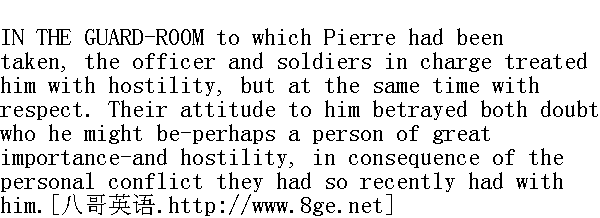 在皮埃尔被带去的那间拘留所里, 逮捕他的军官和士兵对他怀有敌意, 但是又很尊敬他。他们对他的态度令人觉察到他们还有疑虑, 因为不知他是谁(会不会是大人物), 他们怀有敌意, 是因为他们同他的殴斗刚刚过去。 But when on the morning of the next day the guard was relieved, Pierre felt that for his new guard-both officers and soldiers-he was no longer an object of the same interest as he had been to those who had taken him prisoner. And, indeed, in the big, stout man in a peasant's coat, the sentinels in charge next day saw nothing of the vigorous person who had fought so desperately with the pillaging soldier and the convoy, and had uttered that solemn phrase about saving a child; they saw in him only number seventeen of the Russian prisoners who were to be detained for some reason by order of the higher authorities. If there were anything peculiar about Pierre, it lay only in his undaunted air of concentrated thought, and in the excellent French in which, to the surprise of the French, he expressed himself. In spite of that, Pierre was put that day with the other suspicious characters who had been apprehended, since the room he had occupied was wanted for an officer. 但是, 第二天早晨看守换班时, 皮埃尔感到, 新的卫队--军官和士兵们, 已不像逮捕他的人那样对他感兴趣了。的确, 从这个穿农夫大褂的大个儿胖子身上, 第二天的守卫已看不出那个曾绝望地同抢劫者和押送他的士兵斗殴, 并说出拯救孩子的豪言壮语的活生生的人, 而只看到一个因某种原因按上级命令逮捕和关押的第十七号俄国人犯的。假如说皮埃尔身上有什么特别之处, 那也只是他并不胆怯和专心沉沉思的样子, 以及他交谈时操的那一口好得令法国人惊奇的法语。尽管如此, 这天把他同其他被怀疑的人关在一起, 因为他占的单间给一位军官占用了。 All the Russians detained with Pierre were persons of the lowest class. And all of them, recognising Pierre as a gentleman, held aloof from him all the more for his speaking French. Pierre mournfully heard their jeers at his expense. 和皮埃尔一道被关押的全部俄国人, 都是最低阶层的。他们认出他的老爷身份后, 对他会说法语而更疏远他。皮埃尔抑郁地听任他们嘲笑自己。 On the following evening, Pierre learned that all the prisoners (and himself probably in the number) were to be tried for incendiarism. The day after, Pierre was taken with the rest to a house where were sitting a French general with white moustaches, two colonels, and other Frenchmen with scarfs on their shoulders. With that peculiar exactitude and definiteness, which is always employed in the examination of prisoners and is supposed to preclude all human weaknesses, they put questions to Pierre and the others, asking who he was, where he had been, with what object, and so on. 第二天晚上, 皮埃尔得知, 这些人(他也可能包括在内)将以纵火罪受审。第三天, 皮埃尔同另一些人被带进一座房子, 里面坐着一名白胡子的法国将军, 两名上校和另几名臂上系绶带的法国人。这些法国人对皮埃尔等人, 用自以为可以超脱人类弱点的精确和肯定语气(通常对待被告就是如此), 问了: 他是谁?到过哪里?有什么目的?诸如此类的问题。 These questions, leaving on one side the essence of the living fact, and excluding all possibility of that essence being discovered, like all questions, indeed, in legal examinations, aimed only at directing the channel along which the examining officials desired the prisoner's answers to flow, so as to lead him to the goal of the inquiry-that is, to conviction. So soon as he began to say anything that was not conducive to this aim, then they pulled up the channel, and the water might flow where it would. Moreover, Pierre felt, as the accused always do feel at all trials, a puzzled wonder why all these questions were asked him. He had a feeling that it was only out of condescension, out of a sort of civility, that this trick of directing the channel of their replies was made use of. He knew he was in the power of these men, that it was only by superior force that he had been brought here, that it was only superior force that gave them the right to exact answers to their questions, that the whole aim of the proceeding was to convict him. And, therefore, since they had superior force, and they had the desire to convict him, there seemed no need of the network of questions and the trial. It was obvious that all the questions were bound to lead up to his conviction. To the inquiry what he was doing when he was apprehended, Pierre replied with a certain tragic dignity that he was carrying back to its parents a child he had "rescued from the flames." Why was he fighting with the soldiers? Pierre replied that he was defending a woman, that the defence of an insulted woman was the duty of every man, and so on ... He was pulled up; this was irrelevant. With what object had he been in the courtyard of a burning house where he had been seen by several witnesses? He answered that he was going out to see what was going on in Moscow. He was pulled up again. He had not been asked, he was told, where he was going, but with what object he was near the fire. Who was he? The first question was repeated, to which he had said he did not want to answer. Again he replied that he could not answer that. 这些问题, 像法庭上问的全部问题一样, 抛开事情的本质, 排除显示其本质的可能性, 其目的只是要选成一道沟渠, 法官们希望被告的回答顺着这道沟渠流出来, 把被告引向预期目标, 即是判处他的罪行。每当被告开始讲出不适宜判决目的的话, 沟渠就被移开, 水就可以随便流到什么地方。皮埃尔更体会到了被告在所有法庭上都体验到的莫