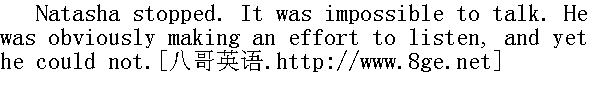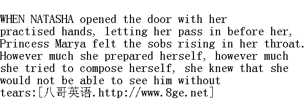 他凝视着她。 "You weep for Nikolushka?" he asked." 你哭尼古卢什卡吗?"他问道。 Princess Marya nodded through her tears. 玛丽亚公爵小姐哭着, 肯定地点点头。 "Marie, you know the Gos ..." he began, but suddenly paused." 玛丽, 你知道《福音》......"但他突然沉默下来。 "What do you say?"" 你说什么?"