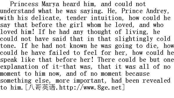 没什么。不该在这里哭呢。"他说, 仍然用冷漠的目光看着她。 When Princess Marya wept he knew that she was weeping that Nikolushka would be left without a father. With a great effort he tried to come back again to life, and to put himself at their point of view. 当玛丽亚公爵小姐哭出来的时候, 他明白, 她是哭尼古卢什卡就要没有父亲了。他集中了一股巨大力量, 努力回到尘世生活中来, 转向她们所抱的看法。 "Yes, it must seem sad to them," he thought. "But how simple it is!"" 是的, 她们应该觉得遗憾!"他想, "不过, 这是多么简单啊!" " 'They sow not, neither do they reap, but your Father feedeth them,' " he said to himself, and he wanted to say it to his sister. But no, they would understand it in their own way; they would not understand! What they cannot understand is that these feelings that they set store by-all our feelings, all these thoughts, which seem of so much importance to us-that they are all not wanted! We cannot understand each other!" and he was silent." 天上的鸟儿不种不收, 你们的主尚且养活它们。"①他自言自语道, 并且想说给公爵小姐听。"啊不, 她们有自己的理解, 她们不会理解的!她们所以不能理解, 是因为她们珍视的感情, 我们觉得重大的思想, 所有这一切--都是无用的。我们不能心灵相通啊!"于是, 他沉默了。 ①是《新约·马太福音》第六章第二十六节。
