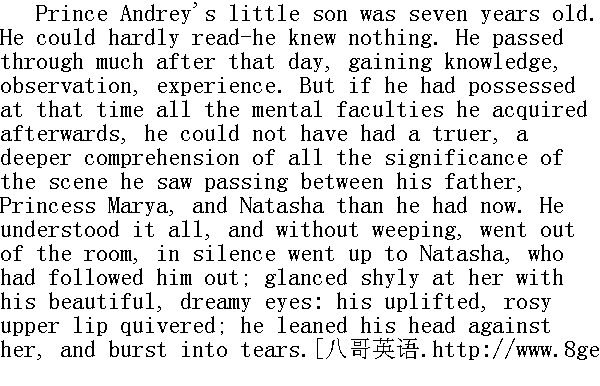 安德烈公爵的小儿子只有七岁。他刚学会识字, 什么也不懂。这天之后, 他感受了很多东西, 得到了知识, 观察力, 经验;但是, 就算他先已具备了这些能力, 他也不可能比这一时刻更好更深刻地明白他父亲, 玛丽亚姑姑和娜塔莎之间的场面的意义。他什么都明白了, 一声不哭就离开了房间, 默默地走到尾随他出来的娜塔莎旁边, 害羞地用沉思的俊秀的眼睛看了看她;他那向上翘着的鲜红的上嘴唇颤抖了, 他把头靠在她身上哭了。 From that day he avoided Dessalle, avoided the countess, who would have petted him, and either sat alone, or shyly joined Princess Marya and Natasha, whom he seemed to love even more than his aunt, and bestowed shy and gentle caresses upon them. 从这天起, 他躲着德萨尔, 躲着爱抚他的伯爵夫人, 要么一个人坐着, 要么胆怯地去接近玛丽亚姑姑和娜塔莎, 他似乎喜欢娜塔莎胜过自己的姑姑, 他悄悄地羞怯地缠着她们。 When Princess Marya left her brother's side, she fully understood all that Natasha's face had told her. She spoke no more to Natasha of hope of saving his life. She took turns with her by his bedside, and she shed no more tears, but prayed without ceasing, turning in spirit to the Eternal and Unfathomable whose presence was palpable now, hovering over the dying man. 玛丽亚公爵小姐走出安德烈公爵房间, 完全明白了娜塔莎脸上告诉她的一切。她不再同娜塔莎谈论挽救他生命的希望。她和她轮流守候在他沙发旁, 不再哭泣, 只是不停地祈祷, 内心求助于那个永恒的不可企及的主宰, 他的存在已经在垂死者的头上感觉到了。
