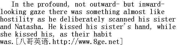 玛丽亚公爵小姐听着, 但不明白他说的话。他, 聪颖温柔的安德烈公爵, 怎么可能当着他所爱的人的面, (而这个人也爱他)说出这样的话呢!假使他还想活下去, 他是不会用冷冷的伤人的口气说出这句话来的。假如他不知道他将死去, 他怎么这样不怜惜她, 怎么能当着她的面说出这句话呢!对此, 只有一个解释: 那就是一切对他都无所谓了, 而一切都无所谓了, 则是因为某种别的最重要的东西给予他以启示。 The conversation was frigid and disconnected, and broke off at every moment. 谈话是没有生气的, 不连贯的, 并时时中断。 "Marie came by Ryazan," said Natasha.Prince Andrey did not notice that she called his sister Marie. And Natasha, calling her by that name before him, for the first time became aware of it herself." 玛丽是取道梁赞来的。"娜塔莎说。安德烈公爵未注意到她叫他的妹妹玛丽。而娜塔莎, 当他的面这样称呼她之后, 却第一次自己注意到了。 "Well?" said he." 呶, 又怎样呢?"他说。 "She was told that Moscow had been burnt to the ground, all of it entirely. That it looks as though ..."" 她听说, 莫斯科全城烧毁了, 完全, 好像......"