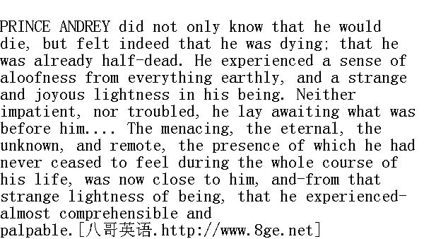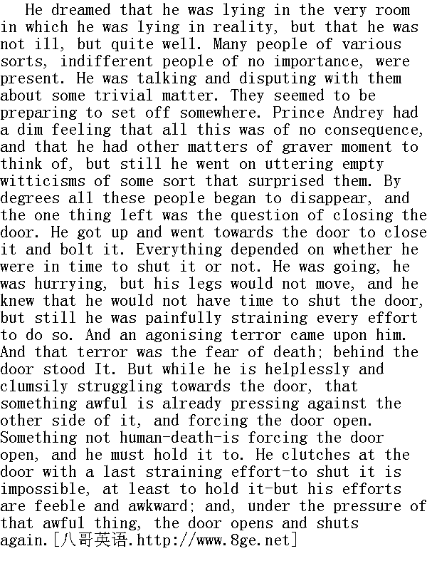 他梦见他躺在他现在躺着的房间里, 但没有受伤, 而是好好的。许多不同人物, 卑微的, 冷淡的, 出现在他面前, 他们同他交谈, 争辩着勿须争辩的事情。他们打算去一个地方。安德烈公爵模糊地想起, 这一切都毫无意义, 他有别的最重要的事务, 但仍继续说下去, 用一些空洞俏皮的话使他们惊讶。渐渐地、不知不觉地, 这些人物全部开始消逝, 一切只剩下一个关门的问题。他起身朝房门走去, 以便插上门栓, 把门关闭好。一切有赖于他来不来得及紧闭房门。他走, 急忙走, 但他的脚不能迈动, 他于是知道他来不及关门, 但仍然徒劳地鼓足全身力量。他陷入痛苦的恐怖之中。这恐怖是死亡的恐怖: "它"就站在门外。但就在他无力地笨拙地朝房门爬去的时候, 这一可怕之物已从另一边压过来, 冲破了房门。某种非人之物--死亡--已快破门而入, 应该把门顶住才对, 他够着门了, 鼓起最后的力气--关门已不可能了--哪怕就顶住它;但他的力气微弱, 而且不灵活, 因而在可怕之物推挤下, 房门被打开, 但是又关上了。 Once more It was pressing on the door from without. His last, supernatural efforts are vain, and both leaves of the door are noiselessly opened. It comes in, and it is death. And Prince Andrey died. 它又一次从那边压过来。他最后的超出自然的力量白费了, 两扇房门无声地被撞开。"它"进来了, 而它就是"死亡"。于是, 安德烈公爵死去。 But at the instant when in his dream he died, Prince Andrey recollected that he was asleep; and at the instant when he was dying, he made an effort and waked up. 但就在死去的那一瞬间, 安德烈公爵想起他是睡着的, 同时, 在死的那一瞬间, 他给自己身上用力, 醒了过来。 "Yes, that was death. I died and I waked up. Yes, death is an awakening," flashed with sudden light into his soul, and the veil that had till then hidden the unknown was lifted before his spiritual vision. He felt, as it were, set free from some force that held him in bondage, and was aware of that strange lightness of being that had not left him since." 是的, 这就是死。我死了--我醒了。是的, 死--便是觉醒。"突然间他的心里亮了起来, 那迄今为止罩住未知物的帘幕, 在他心灵的眼睛面前掀起来了。他感到好像挣脱了以前捆住他的力量, 他感到了从那时以来没有离开过他的那奇怪的轻松。 When he waked up in a cold sweat and moved on the couch, Natasha went up and asked him what was the matter. He did not answer, and looked at her with strange eyes, not understanding her. 当他在冷汗中醒来, 在沙发上动弹的时候, 娜塔莎走到他身旁, 问他是怎么了。他不回答她, 而且不理解她, 只是用奇怪的目光看着她。