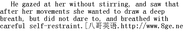 他不眨眼地望着她, 看到每当她自己动一下, 她便要深深叹一口气, 但又不敢这样, 只得小心地喘气。 At the Troitsa monastery they had spoken of the past, and he had told her that if he were to live he should thank God for ever for his wound, which had brought them together again; but since then they had never spoken of the future. 在特罗伊茨修道院, 他俩谈起了过去, 他告诉她, 如果他活着, 他会为自己负伤而永远感谢上帝, 是受伤使他又同她在一起, 但从那以后, 他们从未谈过未来。 "Could it be, or could it not?" he was wondering now as he watched her and listened to the slight steel click of the needles. "Can fate have brought us together so strangely only for me to die? ... Can the truth of life have been revealed to me only for me to have spent my life in falsity? I love her more than anything in the world! But what am I to do if I love her?" he said, and suddenly he unconsciously moaned from the habit he had fallen into in the course of his sufferings." 这可不可能呢?"他此时一边看着她, 听着金属织针轻微的碰击声, 一边想着。"难道命运这样奇怪地带我到她面前, 仅仅是为了让我死去?......难道人生之真理展现在我面前, 仅仅由于我在虚妄中度过了一生?我爱她胜过世界上的一切。可我爱她又能怎么办?"他想, 同时不由自主地习惯性地呻吟起来, 他每当痛苦时就有这样的习惯。 Hearing the sound, Natasha laid down her stocking, and bent down closer to him, and suddenly noticing his shining eyes, went up to him with a light step and stooped down. 听到呻吟声, 娜塔莎放下袜子, 弯腰靠近他, 突然她看见他闪光的眼睛, 便轻快地起身, 走向他身边, 俯下身去。 "You are not asleep?"" 您没睡?"