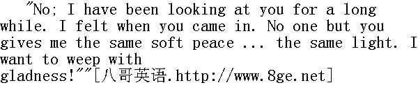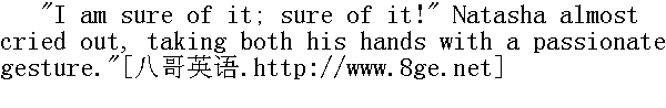 没有, 我朝您看了很久了;您进来我感觉到了。谁都不像您这样给我如此柔和的宁静......光明, 我高兴得很想哭。" Natasha moved closer to him. Her face beamed with rapturous delight. 娜塔莎更靠近了些。她的脸闪耀着狂喜的光辉。 "Natasha, I love you too much! More than everything in the world!"" 娜塔莎, 我太爱您了, 超过世上的一切。" "And I?" She turned away for a second. "Why too much?" she said." 可我呢?"她转过脸去, 只一瞬间, "为什么太爱呢?"她说。 "Why too much? ... Well, what do you think, what do you feel in your heart, your whole heart, am I going to live? What do you think?"" 为什么太爱?......呶, 您怎么想, 您心里, 您整个心有什么感觉: 我能活下去吗?照您看会怎样?"