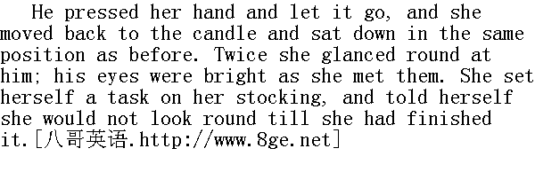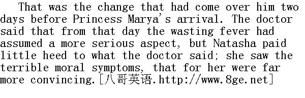 他的病情与他的生理状况一致, 但娜塔莎称之为"他出现了那种情况"的事, 发生在玛丽亚公爵到来的前两天。这是那种生死之间最后的精神上的搏斗, 死亡取得了胜利。这是对生命之珍惜的突然觉醒, 它体现于对娜塔莎的爱情, 也是最后一次屈从地面对未知的恐怖。 It happened in the evening. He was, as usually after dinner, in a slightly feverish condition, and his thoughts were particularly clear. Sonya was sitting at the table. He fell into a doze. He felt a sudden sense of happiness. 这是一个晚上, 他, 饭后总是这样, 处于低烧状态, 但思想异常清晰。索尼娅坐在桌旁, 他在打盹, 突然, 身上出现一股幸福的感觉。 "Ah, she has come in!" he thought." 啊, 这是她来了!"她心里想。 Natasha had, in fact, just come in with noiseless steps, and was sitting in Sonya's place. 果然, 在索尼娅刚才坐的地方传来娜塔莎进门的脚步声。 Ever since she had been looking after him he had always felt this physical sense of her presence. She was in a low chair beside him, knitting a stocking, and sitting so as to screen the light of the candle from him. She had learned to knit since Prince Andrey had once said to her that no one made such a good sick-nurse as an old nurse who knitted stockings, and that there was something soothing about knitting. Her slender fingers moved the needles rapidly with a slight click, and the dreamy profile of her drooping head could be clearly seen by him. She made a slight movement; the ball rolled off her knee. She started, glanced round at him, and, screening the light with her hand, bent over with a cautious, supple, and precise movement, picked up the ball, and sat back in the same attitude as before. 从她开始看护他的时候起, 他便时时体会到与她亲近的这种生理上的感觉。她坐在斜对着他的扶手椅里, 遮住照着他的烛光, 编织袜子。(安德烈公爵有一回告诉她, 谁都不善于像老妈妈那样看护病人, 她们总是一边看护, 一边织袜子, 而织袜子的动作里有安详感, 听了之后, 她便学起编织袜子来了)。她纤细的手指飞快地织着, 时而撞响织针, 她的下垂的沉思的面孔的侧影被他看得很清楚。她动了一下--线团从她膝上滚落。她颤抖一下, 看了他一眼, 用手遮住蜡烛, 小心翼翼地灵活地弯下腰去, 拾起线团, 又坐回原处。