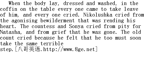 当把洗净的尸体穿好寿衣, 让它躺在桌上的棺材里的时候, 大家前去诀别, 并且都哭了。尼古卢什卡哭了, 困惑的悲痛撕裂他的心。伯爵夫人和索尼娅哭了, 力娜塔莎惋惜并且想到他已不在人世。老伯爵哭了, 想到很快, 他觉得, 他也要跨出这同一可怕的一步。 Natasha and Princess Marya wept too now. But they did not weep for their personal sorrow; they wept from the emotion and awe that filled their souls before the simple and solemn mystery of death that had been accomplished before their eyes. 娜塔莎和玛丽亚公爵小姐现在也在哭泣, 但她们不是出于自己个人的悲伤, 他们哭泣是由于虔敬的感动, 她们的心灵因面对她们所目睹的死亡之隐秘而深受感动, 死亡的隐秘即简单而又庄严。