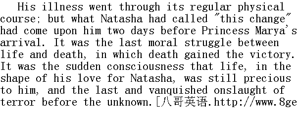 安德烈公爵不仅知道他会死去, 而且感到他正在死去, 并且已经死去一半了。他体验到了远离尘世的意识, 和愉快而奇怪的轻松的感觉。他不着急不慌张地等待他正面临的时限。那威严的永恒的未知的遥远的主宰, 他在自己生命的延续中不断触摸到他的存在, 此时已迫近他, 并且, 照他所体验到的奇怪的轻松的感觉, 几乎是易于理解的, 可以感觉得到的...... In the past he had dreaded the end. Twice he had experienced that terribly agonising feeling of the dread of death, of the end, and now he had ceased to understand it. 他曾经害怕过终极。他两次体验过死亡, 即终极的恐怖这一骇人而痛苦的感觉, 但现在他已不明白这种感觉了。 The first time he had experienced that feeling when the grenade was rotating before him, and he looked at the stubble, at the bushes, at the sky, and knew that death was facing him. When he had come to himself after his wound, and instantly, as though set free from the cramping bondage of life, there had sprung up in his soul that flower of love, eternal, free, not dependent on this life, he had no more fear, and no more thought, of death. 他第一次体验到这种感觉, 是在炮弹像陀螺一样旋转着朝他飞来的时候, 他望着休耕地、灌木丛和天空, 知道这是死神向他扑来。当他负伤后醒来, 他心里刹那间绽开了那犹如从压制着他的人生中挣脱出来的, 永恒的自由的不再受人生之约束的爱的花朵, 于是, 他不惧怕死亡, 也不去想它。 In those hours of solitary suffering and half-delirium that he spent afterwards, the more he passed in thought into that new element of eternal love, revealed to him, the further he unconsciously travelled from earthly life. To love everything, every one, to sacrifice self always for love, meant to love no one, meant not to live this earthly life. And the further he penetrated into that element of love, the more he renounced life, and the more completely he annihilated that fearful barrier that love sets up between life and death. Whenever, during that first period, he remembered that he had to die, he said to himself: "Well, so much the better." 在他负伤后度过的那些痛苦的孤独和半昏迷的日子里, 他愈思考永恒之爱的新原则给他的启示, 他便愈脱离人间生活, 他自己倒不觉得, 爱一切, 爱一切人, 永远为爱牺牲自己, 即是谁也不爱, 即是--不要过人间生活。而且, 他愈是沉浸在爱的原则之中, 他愈是远离着生活, 也愈彻底地清除了当人们没有了爱时, 那道生与死之间的障碍。在他这第一次想到他应该死的时候, 他对自己说: 好吧, 这样更好。 But after that night at Mytishtchy, when in his half-delirium she, whom he had longed for, appeared before him, and when pressing her hand to his lips, he wept soft, happy tears, love for one woman stole unseen into his heart, and bound him again to life. And glad and disturbing thoughts began to come back to him. Recalling that moment at the ambulance station, when he had seen Kuragin, he could not now go back to his feeling then. He was fretted by the question whether he were alive. And he dared not ask. 但在梅季希村那天晚上, 当他在半昏迷中, 那个他想见到的人出现在他面前, 当他把她的手放到自己的嘴唇上, 流下无声的喜悦的眼泪时, 对一个女人的爱情不知不觉潜入他的心中, 又把他同人生联在一起。又喜又惊的思想又来打扰他。回想起他在包扎站见到库拉金那一时刻, 他现在不会再陷入那一次的情感中了: 他现在反而耽心他是否还活着。但他不敢去问。