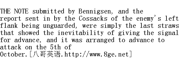 贝尼格森所呈交的有关必须发动进攻的意见书和那个哥萨克所做的关于法军左翼未设防的报告, 只不过是必需下达进攻命令的最后迹象罢了, 于是决定十月五日开始进攻。 On the morning of the 4th, Kutuzov signed the disposition of the forces. Toll read it to Yermolov, proposing that he should superintend the further instructions for carrying it out. 十月四日早晨, 库图佐夫在作战命令上签了字。托尔对叶尔莫洛夫宣读了那个作战命令, 请他作进一步的部署。 "Very good, very good, I haven't time just now," said Yermolov, and he hurried out of the cottage. The arrangement of the troops as drawn up by Toll was an excellent one. The disposition had been written out, as at Austerlitz, though not in German:" 好的, 好的, 我现在没有时间, "叶尔莫洛夫说道, 随即离开了那间农舍小屋。由托尔起草的作战命令写得很漂亮, 和在奥斯特利茨写的作战命令一样, 不过这一次不是用德文写的。 "The First Column marches here and there, the Second Column occupies this place," and so on.On paper all these columns were in their proper place at a fixed time and annihilated the enemy. Everything had been, as in all such cases, carefully thought of, and as in all such cases not a single column did reach its right place at the right time. When a sufficient number of copies of the disposition were ready, an officer was summoned and sent off to give them to Yermolov, that he might see that instructions were given in accordance with them. A young officer of the horseguards, in waiting on Kutuzov, set off for Yermolov's quarters, delighted at the importance of the commission with which he was intrusted. "DieersteColonnemarschiert ①要向某某地点和某某地点进发, dirzweiteColonnemarschiert②要向某某地点和某某地点进发, "等等。在纸面上, 所有这些纵队都在指定时间到达指定位置并消灭敌人。正如所有的作战计划一样, 一切都想得很美满, 也正如执行所有的作战计划一样, 没有一个纵队在所指定的时间抵达所指定的地点。 当作战计划准备好应有的份数之后, 就叫来一位军官, 并派他把文件送给叶尔莫洛夫, 要他去执行。这个年轻的骑兵军官, 库图佐夫的传令官, 对交付给他的任务的重要性感到满意, 他立即驰往叶尔莫洛夫的住处去了。 ②法语: 第二纵队。 "Not at home," Yermolov's servant told him. The officer of the horseguards set off to the quarters of the general, with whom Yermolov was often to be found." 出去了。"叶尔莫洛夫的勤务兵回答道。骑兵军官又前往什尔莫洛夫常去的一位将军那里。 "Not here, nor the general either," he was told." 不在, 将军不在。" The officer mounted his horse again and rode off to another general's. 骑兵军官骑上马, 又前往另外一个人那里。