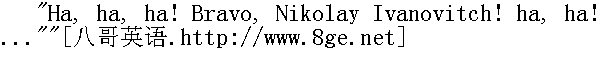 怎么在那里, 在防线以外?" "Two regiments of our fellows have been sent out to the outposts, and there is a spree going on there now, fine doings! Two bands, three choruses of singers."" 他们派了两个团去防卫, 他们在那里寻那么大的开心, 简直吓人!有两个乐队, 三个合唱队。" The officer rode out beyond our lines to Etchkino. While yet a long way off, he heard the gay sounds of a soldier's dance tune sung in chorus. 那个军官驰往防线以外去找叶奇金。他向那所房子驰去, 老远就听见和谐而欢乐的士兵舞曲。 "In the meadows ... in the meadows," he heard with a whistle and string music, drowned from time to time in a roar of voices. The officer's spirits, too, rose at these sounds, but at the same time he was in terror lest he should be held responsible for having so long delayed giving the important message intrusted to him. It was by now nearly nine o'clock. He dismounted and walked up to the entrance of a big manor-house that had been left uninjured between the French and the Russian lines. Footmen were bustling about with wines and edibles in the vestibule and the buffet. Choruses were standing under the windows. The officer was led up to a door, and he saw all at once all the most important generals in the army, among them the big, impressive figure of Yermolov. All the generals were standing in a semicircle, laughing loudly, their uniforms unbuttoned, and their faces flushed and animated. In the middle of the room a handsome, short general with a red face, was smartly and jauntily executing the steps of the trepak." 在草地上......在草地上!......"口笛声和托尔班琴①琴声伴着舞曲, 时而被喊叫声淹没, 那个军官听到这些声音, 心中也很高兴, 但是同时他又有点害怕, 惟恐这么久没有把交付给他的重要的命令送到, 因此而获罪。已经过了八点钟了。他下了马, 走进这所地处俄国人和法国人之间而仍然保存完好的地主住宅的门廊, 在餐厅和过厅里, 听差们正忙碌着端酒上菜, 歌手们站在窗子外面。那个军官被让了进去, 他立刻就看见军队所有的重要的将军们, 其中就有叶尔莫洛夫那高大而显赫的身形。所有的将军们站成半圆形, 都解开了上衣, 脸色通红, 兴高采烈, 高声大笑。在大厅中央, 一个满脸通红、个子不高、容貌俊秀的将军敏捷地跳特列帕克舞。 ①托尔班琴是旧时波兰和乌克兰的一种双颈拨弦乐器。