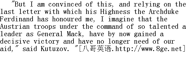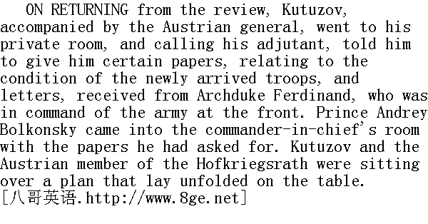 阅兵归来之后, 库图佐夫在奥国将军陪伴下, 走进办公室, 他把一名副官喊来, 吩咐他将开到本地的部队的实际情况的文件和指挥先头部队的费迪南大公的函件一并拿来。安德烈?博尔孔斯基公爵随身带着总司令必需的文件走进他的办公室。库图佐夫和军事参议院的奥籍参议员坐在一份摆在桌上的作战方案前面。 "Ah!" ... said Kutuzov, looking round at Bolkonsky; and inviting his adjutant, as it were, by his word to wait, he went on in French with the conversation. " 啊......"库图佐夫望着博尔孔斯基说道, 他说一声"啊"好像是要副官等候片刻功夫, 这之后便用法国话把已经开始的谈话继续谈下去。 "I have only one thing to say, general," said Kutuzov, with an agreeable elegance of expression and intonation, that forced one to listen for each deliberately uttered word. It was evident that Kutuzov himself listened to his voice with pleasure. "I can only say one thing, that if the matter depended on my personal wishes, the desire of his majesty, the Emperor Francis, should long ago have been accomplished; I should long ago have joined the archduke. And, upon my honour, believe me that for me personally to hand over the chief command of the army to more experienced and skilful generals-such as Austria is so rich in-and to throw off all this weighty responsibility, for me personally would be a relief. But circumstances are too strong for us, general." And Kutuzov smiled with an expression that seemed to say: "You are perfectly at liberty not to believe me, and indeed it's a matter of perfect indifference to me whether you believe me or not, but you have no grounds for saying so. And that's the whole point." The Austrian general looked dissatisfied, but he had no choice but to answer Kutuzov in the same tone. " 将军, 我只说这么一件事, "库图佐夫说道, 用词优美, 语调动听, 迫使对话人倾听他不慌不忙说出的每一个词。显然, 库图佐夫本人也乐于倾听自己说话。"将军, 我只说这么一件事, 如果这件事取决于我本人的愿望, 弗朗茨国王陛下的圣旨老早就履行了。我老早就和大公会合了。请您相信我的人格, 对我本人来说, 把统率军队的最高权力转交给比我更有造诣、更高明的将军, 而奥地利是大有人在的, 只要从我身上卸去一切责任的重担, 那末对我本人来说, 这真是一大乐事。将军, 不过实际情况常比我们的愿望更富有说服力。"库图佐夫微微一笑, 那神色好像是说: "您满有理由不相信我, 姑无论您相信还是不相信, 我是根本不在乎的, 但是您没有根据对我说出这种话。这也就是问题的症结。"奥国将军现出不满意的样子, 所以他不能不用同样的口吻回答库图佐夫。 "On the contrary," he said in a querulous and irritated voice, that contrasted with the flattering intention of the words he uttered; "On the contrary, the participation of your most high excellency in common action is highly appreciated by his majesty. But we imagine that the present delay robs the gallant Russian troops and their commander-in-chief of the laurels they are accustomed to winning in action," he concluded a phrase he had evidently prepared beforehand. " 与此相反, "他用埋怨的愤怒的口气说, 这种口气和他含有谄媚意味的话语相抵触, "与此相反, 陛下高度赞赏阁下参与我们的共同事业。但是我们一直认为, 目下的延宕会使俄国军队及其总司令丧失他们通常在大战中所赢得的胜利的桂冠。"看来他已把事先准备要说的话说完了。 Kutuzov bowed, still with the same smile. 库图佐夫脸上仍然保持着笑意, 行了一鞠躬礼。