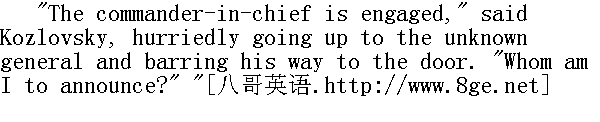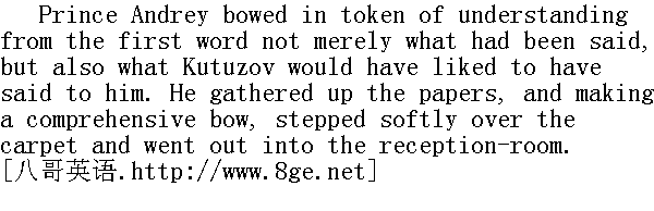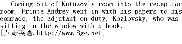 安德烈公爵走出库图佐夫办公室, 来到接待室, 他随身带着公文问一个同事--正在窗前看书的值班副官科兹洛夫斯基面前走去。 "What is it, prince?" queried Kozlovsky. " 喂, 公爵, 怎么啦?"科兹洛夫基斯问。 "I am told to make a note of the reason why we are not moving forward." " 接到命令要拟出一份官方记事公文, 借以说明我们为什么不向前推进。" "And why aren't we?" " 为什么呢?" Prince Andrey shrugged his shoulders 安德烈公爵耸耸肩膀。