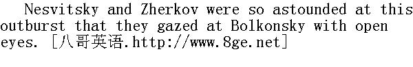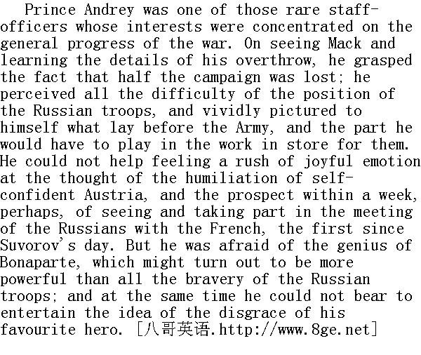 司令部里只有寥寥无几的军官才很关心战事的全部进程, 安德烈公爵是其中之一。安德烈公爵看见马克并听见他的军队覆没的详情之后, 他心中明白, 半个战局已经输完了, 俄军的处境极其艰难。他很生动地想到军队即将面临何种局面, 他在军队中应当发挥何种作用。当他一想到过于自信的奥国遭到可耻的失败, 再过一个礼拜也许会亲眼看到并且参与苏沃洛夫之后的史无前例的俄法武装冲突, 他就禁不住会产生一种激动的喜悦的感情。但是他害怕那比俄军英勇更胜一筹的波拿巴的天才, 同时他也不能容许自己的英雄蒙受奇耻大辱。 Excited and irritated by these ideas, Prince Andrey went towards his own room to write to his father, to whom he wrote every day. In the corridor he met Nesvitsky, the comrade with whom he shared a room, and the comic man, Zherkov. They were, as usual, laughing at some joke. 这些心事使安德烈公爵感到激动和恼怒, 他向自己房里走去, 给父亲写信, 他每日都给父亲写信, 他在走廊上碰见同屋居住的涅斯维茨基和诙谐的热尔科夫。同平日那样, 他们不知道为什么而笑。 "What are you looking so dismal about?" asked Nesvitsky, noticing Prince Andrey's pale face and gleaming eyes. " 你怎么这样忧愁?"涅斯维茨基发现安德烈公爵脸色苍白, 两眼闪闪发光, 于是问道。 "There's nothing to be gay about," answered Bolkonsky. " 没有什么可开心的。"博尔孔斯基答道。 Just as Prince Andrey met Nesvitsky and Zherkov, there came towards them from the other end of the corridor Strauch, an Austrian general, who was on Kutuzov's staff in charge of the provisioning of the Russian army, and the member of the Hofkriegsrath, who had arrived the previous evening. There was plenty of room in the wide corridor for the generals to pass the three officers easily. But Zherkov, pulling Nesvitsky back by the arm, cried in a breathless voice: 当安德烈公爵碰见涅斯维茨基和热尔科夫时, 昨日刚刚抵达的奥国将军施特劳赫和奥国军事参议院参议员从走廊的另一边迎面走来;这个奥国将军留驻于库图佐夫司令部, 监察俄国军队的粮食供应。走廊很宽绰, 有空地方可供两个将军和三个军官自由通行;但是热尔科夫把涅斯维茨基推开, 气喘吁吁地说道: