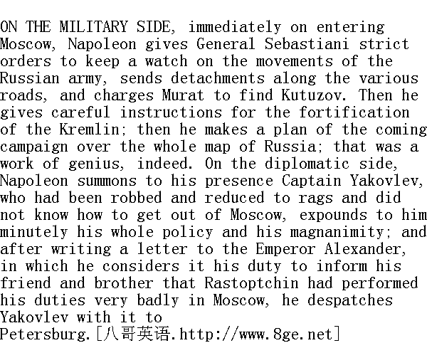 在军事方面, 拿破仑一进驻莫斯科就严令塞巴斯蒂安尼将军注意俄国军队的行动, 向各条道路派出兵团, 责成缪拉去寻找库图佐夫。然后他又详细布置大力加强克里姆林宫的防卫工作, 然后在全俄版图上制定未来战役的天才计划。在外交方面, 拿破仑把那个遭到抢劫、衣衫褴褛、不知道怎样才能逃出莫斯科的雅可夫列夫上尉①叫来, 详细地对他说明他的全部政策和他的宽大, 并且寄了一封给亚历山大皇帝的信, 他在信中说他有责任通知他的朋友和兄弟, 拉斯托普钦在莫斯科把工作做得很糟, 然后就打发雅可夫列夫去彼得堡。 ①近卫军上尉雅可夫列夫是著名作家亚历山大·赫尔岑的父亲。 Expounding his views and his magnanimity with equal minuteness to Tutolmin, he despatches that old man too to Petersburg to open negotiations. 他又向图托尔明详细讲述了他的想法和宽大政策之后, 他又把这个老头子派往彼得堡去进行谈判。 On the judicial side, orders were issued, immediately after the fires broke out, for the guilty persons to be found and executed. And the miscreant Rastoptchin was punished by the order to set fire to his houses. 在司法方面, 火灾之后, 他立刻下令, 捉拿纵火犯, 处以死刑。对坏蛋拉斯托普钦, 下令烧掉他的住宅, 以示惩罚。 On the administrative side, Moscow was presented with a constitution. A municipal council was instituted, and the following proclamation was issued:- 在行政方面, 他赐给莫斯科一部宪法, 成立市政府, 颁发了如下告示: