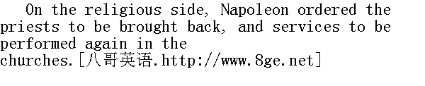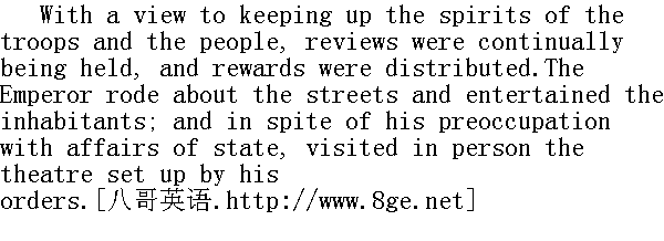 为了鼓舞和提高部队和人民的精神, 不断地举行检阅和颁奖。皇帝骑着马巡视街道, 安抚居民, 他虽然操劳着国家大事, 仍然亲临他下令建立的剧院看戏。 As regards philanthropy, too-the fairest jewel in the conqueror's crown-Napoleon did everything that lay within him. On the benevolent institutions he ordered the inscription to be put up, "Maison de ma mere," thereby combining a touching filial sentiment with a monarch's grandeur of virtue. He visited the Foundling Home; and as he gave the orphans he had saved his white hands to kiss, he conversed graciously with Tutolmin. Then, as Thiers eloquently recounts, he ordered his soldiers' pay to be distributed among them in the false Russian notes he had counterfeited:- 在慈善事业方面(慈善事业是君王最高的德政)拿破仑也做了他所能做的一切事情。他吩咐在慈善院的建筑物上书写"Maisondemamere"①几个大字, 这样, 就把做儿子的孝敬之情和浩荡的皇恩结合起来了。他参观孤儿院, 他让他所拯救的孤儿吻他那双白净的手, 和蔼地和图托尔明谈话。随后, 据梯也尔花言巧语地叙述, 他命令把他伪造的俄国钞票发给他的士兵们作为薪饷。 ①法语: 吾母之家。 "Reinforcing the use of these methods by an act worthy of him and of the French army, he had assistance distributed to those who had suffered loss from the fire. But as provisions were too precious to be given to strangers, mostly enemies, Napoleon preferred to furnish them with money for them to provide themselves from without, and ordered paper roubles to be distributed among them." Relevantl'emploidecesmoyensparunactedignedeluietdel'armeefrancaise, ilfitdistribuerdessecoursauxincendies Maislesvivresetanttropprecieuxpouretredonnesadesetrangerslaplupartennemis, Napoleonaimamieuxleurfournirdel'argentafinqu'ilssefournissentauxdehors, etilleurfitdistribuerdesroublespapiers.② With a view to maintaining discipline in the army, orders were continually being issued for severely punishing nonfulfilment of military duty and for putting an end to pillaging. 在军纪方面, 连续发出严惩玩忽职守和禁止抢劫的命令。