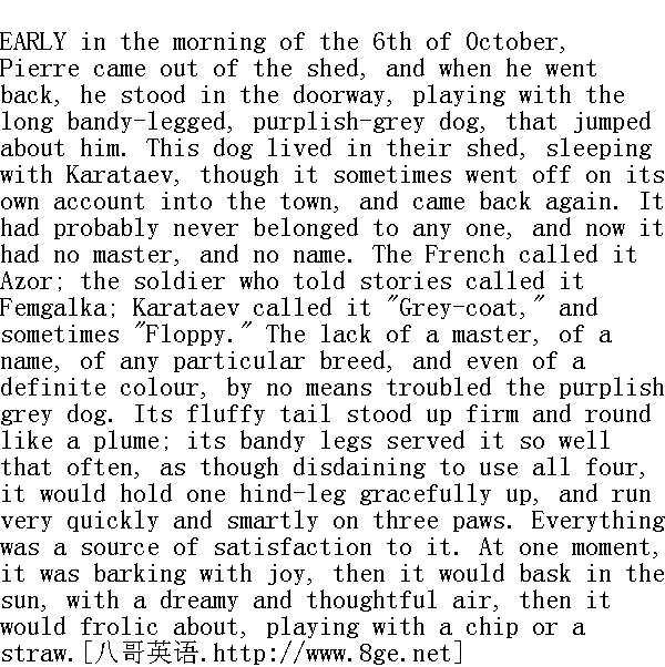 十月六日清晨, 皮埃尔走出棚子, 返回来的时候, 在门旁边停了下来, 逗玩一只围着他跳的身子长、腿又短又弯、毛色雪青的小狗。这条小狗住在他们的棚子里, 夜间和卡拉塔耶夫睡在一起, 它有时跑进城里, 然后又跑回来。他大概从来都不属于任何人, 而现在也仍然不属于任何人, 也从来没有一个名字, 法国人叫它阿佐尔, 喜欢讲故事的那个士兵叫它费姆加尔卡, 卡拉塔耶夫和其他人都叫它小灰子, 有时候叫它薇薇。它没有主人, 没有名字, 甚至种属也不明, 毛色也不清, 所有这一切, 似乎并没有使那条蓝灰色的小狗为难。它那毛茸茸的尾巴像帽子上插的羽毛直竖起来, 又硬又圆, 罗圈腿是那么听使唤, 它常常优美地提起一条后腿, 很轻快、很迅捷地用三条腿跑路, 好像不屑于把四条腿都用上一样。一切都使它高兴。它一会儿欢快地汪汪叫着在地上打滚, 一会儿带着若有所思的神情晒太阳, 一会儿玩弄着一块木片或一根干草。 Pierre's attire now consisted of a dirty, tattered shirt, the sole relic left of his previous wardrobe, a pair of soldier's drawers, tied with string round the ankles by Karataev's advice, for the sake of warmth, a full peasant's coat and a peasant's cap. Physically Pierre had changed greatly during this period. He no longer seemed stout, though he still had that look of solidity and strength that was characteristic of the Bezuhov family. The lower part of his face was overgrown with beard and moustaches; his long, tangled hair, swarming with lice, formed a mat of curls on his head. His eyes had a look of firmness, calm, and alert readiness, such as had never been seen in Pierre's face before. All his old slackness, which had shown even in his eyes, was replaced now by a vigorous, alert look of readiness for action and for resistance. His feet were bare. 皮埃尔的衣服现在只有一件又脏又破的衬衫(他原有的衣服剩下的唯一的一件), 一条用农民的长衫和帽子改制成的士兵的裤子, 按照卡拉塔耶夫的意见, 用绳子把裤脚扎上以保暖。皮埃尔在这一时期身体变化很大。虽然从外表上来看, 他依然具有他们家族遗传的强迫有力的体魄, 但是他已经没有那么胖了。脸的下半截长满了胡子;满头乱发生满了虱子, 盘在头上的头发就像一顶帽子。眼睛的表情坚定、平静、机灵和充满活力, 皮埃尔从前从来没有过这种表情。从前他那种松懈、散漫的眼神, 现在却换上一付精力饱满、随时准备行动和反抗的奋进精神。他的双脚是光着的。 Pierre looked over the meadow, across which waggons and men on horseback were moving that morning, then far away beyond the river, then at the dog, who was pretending to be meaning to bite him in earnest, then at his bare feet, which he shifted with pleasure from one position to another, moving the dirty, thick, big toes. And every time he looked at his bare feet, a smile of eager self-satisfaction flitted across his face. The sight of those bare feet reminded him of all he had passed through and learned during this time; and the thought of that was sweet to him. 皮埃尔忽而看着从那天早上就行驶着大量车辆和骑马的人所经过的田野, 忽而又看着河对岸的远方, 忽而又看着那只装出真心要咬他的小狗, 忽而又看着自己的一双光腿板, 然后他饶有兴味地把这一双光脚摆成各种不同的姿势, 翘动着粗大、脏污的脚趾头。每当他看着自己的那一双光脚板, 脸上就露出兴奋和得意的微笑。这一双光脚板的模样, 使他想起这一段时间所有的经历和所懂得的道理, 这一段回忆使他感到愉快。 The weather had for several days been still and clear, with light frosts in the mornings-the so-called "old granny's summer." 一连许多天, 都是风和日丽, 每天早晨有一层薄霜--所谓的"晴和的初秋"。 It was warm out of doors in the sunshine, and that warmth was particularly pleasant, with the bracing freshness of the morning frost still in the air. 在室外, 在阳光下, 暖洋洋的, 这种温暖加上早晨的微寒, 空气清新, 凉爽宜人, 使人感到格外愉快。
