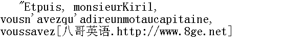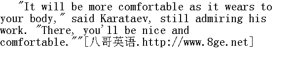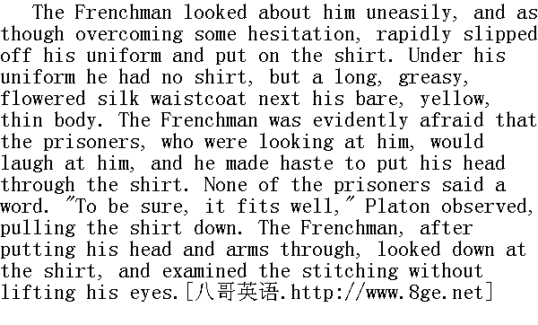Oh, c'estun...quinoubliejamaisrien.Ditesaucapitainequandilferasatournee, ilferatoutpourvous..."① ①法语: 还有, 基里尔先生, 您只要对上尉说一声就行了, 您知道......他这个人......什么都放在心上。他再来巡视时, 您对上尉说吧, 他什么都会为您办的...... The captain of whom the corporal spoke used often to have long conversations with Pierre, and did him all kinds of favours. 班长所说的那个上尉, 时常和皮埃尔长谈, 给他以各种照顾。 "'You see, St. Thomas," he said to me the other day, 'Kiril is a man of education, who speaks French; he is a Russian lord who has had troubles, but he is a man. And he understands ... If he wants anything, let him tell me, he shall not meet with a refusal. When one has studied, one likes education, you see, and well-bred people.' It's for your own sake I tell you that, M. Kiril. In the affair that happened the other day, if it hadn't been for you, things would have ended badly." "Vois-tu, St Thomas, qu'ilmedisaitl'autrejour: Kirilc'estunhommeguiadel'instruction, quiparlefranBcais;c'estunseigneurrusse, quiaeudesmalheurs, maisc'estunhomme.Etils'yentendle...S'ildemandequelquechose, qu'ilmedise, iln'yapasderefus.Quandonafaitsesetudes, voyezvous, onaimel'instructionetlesgenscommeilfaut.C'estpourvousquejediscela, monsieurKirBil.Dansl'affairedel'autrejoursicen'etaitavous, caauraitfinimal."② (The corporal was alluding to a fight a few days before between the prisoners and the French soldiers, in which Pierre had succeeded in pacifying his companions.) After chatting a little time longer the corporal went away.Several of the prisoners had heard Pierre talking to the corporal, and they came up immediately to ask what the latter had said. While Pierre was telling his companions what the corporal had said about setting off from Moscow, a thin, sallow, ragged French soldier came up to the door of the shed. With a shy and rapid gesture he put his fingers to his forehead by way of a salute, and addressing Pierre, asked him if the soldier, Platoche, who was making a shirt for him, were in this shed. 那个班长又闲谈了一会儿以后, 就走了。(那个班长所说的前几天发生的事, 是俘虏们和法国人打了一架, 皮埃尔劝阻了自己的同伴, 使事件平息下来了。)有几个俘虏在听了皮埃尔和那个班长的谈话之后, 立即问皮埃尔, 那个班长说了些什么, 皮埃尔告诉同伴们说, 班长说, 法国军队已经出发了, 这时, 一个面黄肌瘦, 衣衫褴褛的法国兵来到棚子门前。他向着皮埃尔迅速而胆怯地把手指举到额头表示敬礼, 他问皮埃尔, 给他缝衬衫的士兵普拉托什是否在棚子里。 The French soldiers had been provided with linen and leather a week previously, and had given out the materials to the Russian prisoners to make them boots and shirts. 一星期之前, 法国人领到了一批皮料和麻布, 分发给俘虏们缝制靴子和衬衫。 "It's ready, darling, it's ready!" said Karataev, coming out with a carefully folded shirt. On account of the heat and for greater convenience in working, Karataev was wearing nothing but a pair of drawers and a tattered shirt, as black as the earth. He had tied a wisp of bast round his hair, as workmen do, and his round face looked rounder and more pleasing than ever." 做好了, 做好了, 小伙子!"卡拉塔耶夫拿着叠得很整齐的衬衫走出来说道。由于天气暖和, 也为了干活方便, 卡拉塔耶夫只穿着一条裤子和一件黑得像泥土一样的破衬衫。他像工匠那样, 把头发用蒡提树皮扎了起来, 他的圆脸似乎比以前更圆更愉快了。 "Punctuality is own brother to good business. I said Friday, and so I have done it," said Platon, smiling and displaying the shirt he had made." 诺言--事业的亲兄弟。说星期五做好, 就星期五做好。"普拉尔笑着解开他缝好的衬衫说道。