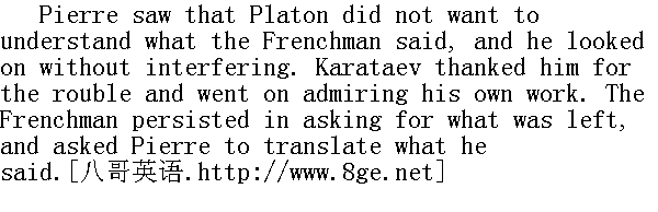 皮埃尔看出普拉东并不想要弄懂法国人的话, 所以他只在一旁看, 并不去干预。卡拉塔耶夫谢了法国人的钱, 仍在继续欣赏自己的作品。那个法国人坚持要回所剩的碎布, 于是, 他请皮埃尔把他的话翻译一下。 "What does he want with the pieces?" said Karataev. "They would have made me capital leg wrappers. Oh well, God bless the man."And, looking suddenly crestfallen and melancholy, Karataev took a bundle of remnants out of his bosom and gave it to the Frenchman without looking at him. "Ach-ma!" he cried, and walked away. The Frenchman looked at the linen, he hesitated, glanced inquiringly at Pierre, and as though Pierre's eyes had told him something:" 他要那些碎布头有什么用处?"卡拉塔耶夫说。"我们可以用来做一副很好的包脚布。好, 上帝保佑他。"卡拉塔耶夫突然脸色阴沉下来, 从怀里掏出来一卷碎布头, 连着也不看那个法国人一眼, 递给了他。"哎呀, 真是!"卡拉塔耶夫掉头就往回走, 法国人看了一下那些碎布头, 沉思片刻, 以询问的目光看着皮埃尔, 皮埃尔的目光好像在对他说什么。 "Here, Platoche!" he cried in a shrill voice, suddenly blushing. "Keep them yourself," he said, and giving him the remnants, he turned and went out. "Platoche, ditesdonc, Platoche, " ④法国人突然间脸涨红了, 尖声叫喊道。"Gradezpourvous."⑤他说着就把那些碎布头又递了过去, 转身就走开了。 ④法语: 普拉东, 我说, 普拉东, "There, look'ee now," said Karataev, shaking his head. "They say they're not Christians, but they have souls too. It's true what the old folks used to say: a sweating hand is an open hand, but a dry hand is closefisted. His own back's bare, and yet he has given me this." Karataev paused for a while, smiling dreamily and gazing at the cuttings of linen. "But first-rate leg binders they'll make me, my dear," he added, as he went back into the shed." 你瞧, 这有多怪, "卡拉塔耶夫摇着头说道。"人们说他们都不是基督教徒, 而他们也有良心。这就是老人们常说的那句话: '汗手是张着的, 干手是拳着的。'(越是有钱的人越吝啬, 越是穷的人越大方。--译者注。)他自己光着身子, 但是, 他还是把那些东西还给我了。"卡拉塔耶夫若有所思地笑了一笑, 然后, 他望着那些剩下来的碎布头, 沉默了好一阵子。"可以用这东西做出一副很不错的包脚布呢, 亲爱的朋友们。"他说了这句话后, 走回到栅子里去了。