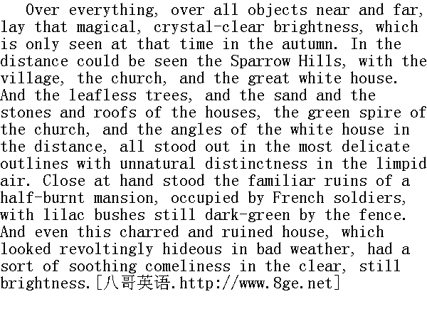 在所有的东西上面, 不论是近处的还是远处的东西上面, 都有一层神秘的、明净的光辉, 这只有在这个时期的秋天才可以见到。在远方的麻雀的和那个村庄, 那所教堂, 以及那处高大的白色房屋都清晰可见。光秃秃的树林、沙地、石头、房顶、教堂的绿色塔顶、远处那所白色房屋的墙角--所有这一切物体的最精细的线条, 异常清晰地, 在透彻明亮的空气中显露出来了。近处是随处都可以看到的法军占领的被焚毁的贵族宅第的断垣残壁, 在垣墙周围还有墨绿色的丁香树丛。甚至这座在阴暗的天气丑得可憎的污秽的废墟, 这时, 在明朗、宁静的光辉中, 也显露出一种令人欣慰的美。 A French corporal, in a smoking-cap, with his coat comfortably unbuttoned, came round the corner of the shed, with a short pipe between his teeth, and with a friendly wink, approached Pierre. 一个法军班长随便地敞着衣襟、头戴一顶便帽, 嘴里叨着烟斗, 从棚子的角落处走了出来, 走到皮埃尔跟前, 友好地向他挤挤眼。 "What sunshine, hein, M. Kiril?" (This was what all the French soldiers called Pierre.) "One would say it was spring." And the corporal leaned against the door, and offered Pierre his pipe, though he was always offering it, and Pierre always declined it. "Quelsoleil, hein, monsieurKiril? (法国人都这样称呼皮埃尔), Ondiraitleprintemps."①于是那个班长靠在门上, 把他的烟斗递给皮埃尔, 虽然不论什么时候他递过来, 皮埃尔总是拒绝。 ①法语: 多么好的太阳, 嗯, 基里尔先生, 简直是春天。