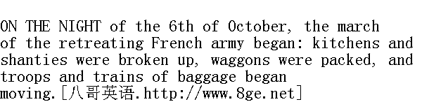 从十月六日晚到七日晨, 一夜之间法国人开始撤退行动: 拆掉棚子和厨房, 装好车子, 部队和辎重队先行出发了。 At seven o'clock in the morning an escort of French soldiers in marching order, in shakoes, with guns, knapsacks, and huge sacks, stood before the sheds and a running fire of eager French talk, interspersed with oaths, was kept up all along the line. 七日晨七时, 在棚屋前面站着一列全副行军装束、头戴高筒军帽、荷枪实弹、身背背包和大口袋的押送队伍, 整个队伍喧闹着, 可以听到从各排中发出的法国式的咒骂声。 In the shed they were ready, dressed and belted and shod, only waiting for the word of command to come out. The sick soldier, Sokolov, pale and thin, with blue rings round his eyes, sat alone in his place, without boots or out-of-door clothes on. His eyes, that looked prominent from the thinness of his face, gazed inquiringly at his companions, who took no notice of him, and he uttered low groans at regular intervals. It was evidently not so much his sufferings-he was ill with dysentery-as the dread and grief of being left alone that made him groan. 在棚子里大家全都作好了准备, 穿好了衣服, 扎上腰带, 穿好靴子, 只等候着出发的命令。那个生病的士兵索科洛夫, 面色苍白、瘦削、眼睛周围乌黑发青, 只有他一个人, 既没有穿衣服, 也没有穿靴子, 仍坐在原来的地方, 两只瘦得鼓突出来的眼球疑问地凝望着此刻不注意他的伙伴们, 并发出均匀的低声呻吟。显然, 使他呻吟的与其是痛苦(他得的是严重的痢疾病), 不如说是他对于独自一人被留下来的恐惧和悲伤。 Pierre was shod with a pair of slippers that Karataev had made for him out of the leather cover of a tea-chest, brought him by a Frenchman for soling his boots. With a cord tied round for a belt, he went up to the sick man, and squatted on his heels beside him. 皮埃尔腰间扎着一条绳子, 穿的是卡拉塔耶夫用从茶叶箱上撕下来的皮子做成的鞋(这是一个法国士兵拿来为自己补靴底的), 走到病人身旁, 蹲下身子。 "Come, Sokolov, they are not going away altogether, you know. They have a hospital here. Very likely you will be better off than we others," said Pierre." 怎么样, 索科洛夫, 他们并非全都走光!他们在这里还有个医院, 你可能比我们这些人会更好些, "皮埃尔说。