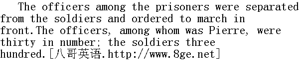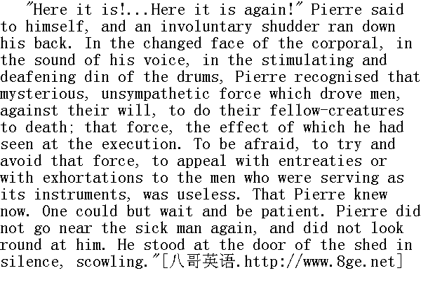 上尉说, "Filez, filez。"③他对皮埃尔连看都不看一眼, 不停催促着。"Maisnon, ilestal'agonie..."④皮埃尔刚开始说。"Voulezvousbien?!"⑤上尉皱着眉头, 怒冲冲地大喝一声。 ③法语: 他也得走, 妈的, 快走, 快走。 ④法语: 可是不行啊, 他快死啦...... ⑤法语: 去去去?!...... "Dram-da-da-dam, dam-dam," rattled the drums, and Pierre knew that the mysterious force had already complete possession of those men, and that to say anything more now was useless." 得咚!咚咚!咚!"鼓擂得震天响。皮埃尔明白, 这一神秘的力量已经完全控制住这些人了, 现在随便你再说什么都没有一点用处。