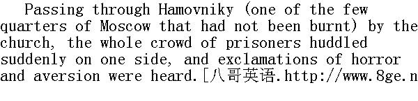 在经过哈莫夫尼克区(莫斯科少数未被烧毁的一个地区)的一所教堂时, 全体俘虏突然闪到一旁, 发出恐怖和憎恶的叫喊声。 "The wretches! The heathens! Yes; a dead man; a dead man; it is...They have smeared it with something."" 哎呀, 这些坏蛋!真是些没心肝的东西!"那是个死人, 是个死人......脸上还涂了一脸黑糊糊的。 Pierre, too, drew near the church, where was the object that had called forth these exclamations, and he dimly discerned something leaning against the fence of the church enclosure. From the words of his companions, who saw better than he did, he learnt that it was the dead body of a man, propped up in a standing posture by the fence, with the face smeared with soot. 皮埃尔听到惊叫声, 向教堂走过去, 模模糊糊地看见有个东西倚靠在教堂的墙上。从看得比他更清楚的同伴的口中知道, 那是一具死尸, 直立着靠在墙上, 脸上涂满煤烟灰。 "Move on, damn you! Go on, thirty thousand devils!"...They heard the escort swearing, and the French soldiers, with fresh vindictiveness, used the flat sides of their swords to drive on the prisoners, who had lingered to look at the dead man. "Marchez, sacrenom...Filez...trentemillediables..." ①响起押送士兵的咒骂声, 法国士兵的态度又粗暴起来, 挥舞短刀把看死尸的俘虏赶开。 | |