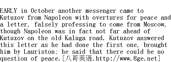 十月初, 又有一位信使带着拿破仑的信来见库图佐夫, 建议和谈, 他谎称是从莫斯科来的。而当时拿破仑已在离库图佐夫前面不远处的旧卡卢日斯卡雅大路上。库图佐夫对这一封信作了和对洛里斯顿带来的第一封信同样的答复: 他说, 不可能进行和谈。 Soon after this Dorohov's irregulars, which were moving on the left of Tarutino, sent a report that French troops had appeared at Fominskoe, that these troops were of Broussier's division, and that that division, being separate from the rest of the army, might easily be cut to pieces. The soldiers and officers again clamoured for action. The staff generals, elated by the easy victory of Tarutino, urged on Kutuzov that Dorohov's suggestion should be acted upon.Kutuzov did not consider any action necessary. A middle course, as was inevitable, was adopted; a small detachment was sent to Fominskoe to attack Broussier. 在此之后不久, 在塔鲁丁诺左侧一带活动的多洛霍夫的游击队送来一份报告, 称在福明斯克出现布鲁西埃的一个师, 这个师和其他部队失去了联系, 很容易被歼灭。士兵们和军官们又要求行动了。参谋部的将军们被在塔鲁丁诺轻易获胜所鼓舞, 坚决要求库图佐夫采纳多洛霍夫的建议。但库图佐夫则认为没有必要发动任何进攻, 于是采取了折衷办法: 做一件应该做的事, 派一支不大的部队到福明斯克去袭击布鲁西埃。 By strange chance this appointment, a most difficult and most important one, as it turned out to be later, was given to Dohturov, that modest little general, whom no one has depicted to us making plans of campaign, dashing at the head of regiments, dropping crosses about batteries, or doing anything of the kind; whom people looked on and spoke of as lacking decision and penetration, though all through the Russian wars with the French, from Austerlitz to the year 1813, we always find him in command where the position is particularly difficult. At Austerlitz he was the last to remain at the ford of Augest, rallying the regiments, saving what he could, when all was flight and ruin, and not a single other general was to be found in the rearguard. When ill with fever, he marched with twenty thousand men to Smolensk to defend the town against the whole of Napoleon's army. In Smolensk he had only just fallen asleep at the Malahovsky gates in a paroxysm of fever when he was waked by the cannonade of Smolensk, and Smolensk held out a whole day. At Borodino when Bagration was killed, and nine-tenths of the men of our left flank had been slain, and the fire of all the French artillery was turned upon it, Kutuzov made haste to recall another general he had sent by mistake, and sent there no other than Dohturov, who was said to be lacking in decision and penetration. And unpretentious little Dohturov went there, and Borodino became the greatest glory of the Russian arms. And many of its heroes have been celebrated in prose and verse, but of Dohturov hardly a word. Again Dohturov was sent to Fominskoe, and from there to Maley Yaroslavets, the place where the last battle was fought with the French, and where it is plain the final destruction of the French army really begun. And again many heroes and men of genius are described to us in accounts of this period of the campaign, but of Dohturov nothing is said, or but few words of dubious praise. This silence in regard to Dohturov is the plainest testimony to his merits. 由于奇异的巧合, 多赫图罗夫接受了这一任务, 后来表明这是一件最困难和最重要的任务。多赫图罗夫--就是那个谦虚、矮小的多赫图罗夫。没有任何一个人向我们描述过, 他曾制定过作战计划、在团队前跑来跑去, 给炮兵连发十字勋章, 等等, 大家都认为他优柔寡断, 没有远见, 但是, 也就是这个多赫图罗夫, 在整个俄法战争中--从奥斯特利茨到一九一三年的历次战争中, 只要哪里战况艰难, 就都有他在场指挥。在奥斯特利茨战役中, 当所有的官兵死的死, 逃的逃, 后卫连一个将军也没有的时候, 他把残部集结起来, 拯救那可以拯救的一切, 在奥格斯特大坝坚守到最后。他正染上疟疾, 还率领两万人马奔赴斯摩棱斯克抗击拿破仑的车队, 保卫了这座城市。在斯摩棱斯克, 在莫洛霍夫斯基城门, 他的疟疾病发作了, 刚刚睡着, 攻城的炮声惊醒了他, 斯摩棱斯克城坚守了整整一天。在波罗底诺战役中, 巴格拉季翁阵亡了, 我军左翼部队损失了十分之九, 法国炮兵全力向那儿进攻, 派到那里去的不是别人, 正是这个优柔寡断、缺少远见的多赫图罗夫, 库图佐夫原来是派另外的人去的, 后来他赶快纠正了这一错误。于是这个文静矮小的多赫图罗夫到那儿去了, 波罗底诺成为俄国军队的最大光荣。在诗歌和散文中向我们描写了很多英雄, 但却没有一句提到多赫图罗夫。又是多赫图罗夫被派到福明斯克, 从那里又到小雅罗斯维茨, 在那里同法国人打了最后一仗, 显然, 法国人的灭亡也就是从这里开始的, 在这一期间的若干战役中又向我们描绘了许多天才和英雄, 但是, 关于多赫图罗夫仍然是一句不提, 或者是轻描淡写, 或者是含糊其辞。对于多赫图罗夫这样避而不谈, 反而更加证实了他的优点。 It is natural that a man who does not understand the working of a machine should suppose, when he sees it in action, that a shaving that has fallen into it by chance, and flaps about in it, hindering its progress, is the most important part of the mechanism. Any one who does not understand the construction of the machine cannot conceive that this shaving is only clogging and spoiling it, while the little cog-wheel, which turns noiselessly, is one of the most essential parts of the machine. 自然, 一个不懂