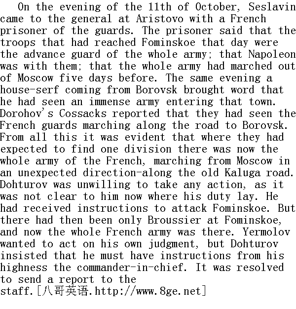 十月十一日晚, 谢斯拉温带一名他俘虏的法国近卫军士兵来到阿里斯托沃村来见司令官。俘虏说, 当天进入福明斯克的军队是整个大军的前卫部队, 拿破仑就在其中, 全军离开莫斯科已经是第五天了。就在当天晚上, 从博罗夫斯克来了一名杂役, 他说, 他看到了大批法国军队开进城里。多洛霍夫游击队的哥萨克也报告, 他们看到了法国军队顺着大路开往博罗夫斯克。所有这些情报都明显地表明, 原先只想到在那里只有一个师, 而现在却是全部法国军队, 他们从莫斯科出发之后, 走的是一条出人意料之外的路线--旧卡卢日斯卡雅大路。多赫图罗夫不愿采取任何行动, 因为他现在还不明确他的责任是什么。他接受的任务是袭击福明斯克。但是原先在福明斯克只有布鲁西埃一个师, 而现在是全部法国军队。叶尔莫洛夫想要相机而行, 但是多赫图罗夫坚持必须等待最高爵爷的命令。于是, 决定派人去向总部报告。 For this purpose they chose a capable officer, Bolhovitinov, who was to take a written report, and to explain the whole matter verbally. At midnight Bolhovitinov received his despatch and his verbal instructions, and galloped off to headquarters, accompanied by a Cossack with spare horses. 为此, 选派了一名精明强干的军官博尔霍维季诺夫, 他除了呈递书面报告外, 还要在口头上能把全部情况报告清楚。夜里十一点多钟, 博尔霍维季诺夫接受了书面报告和口头指示, 就带领一名哥萨克和几匹可以轮换骑的马, 飞快驰往总司令部。
