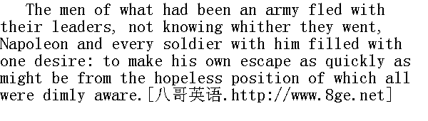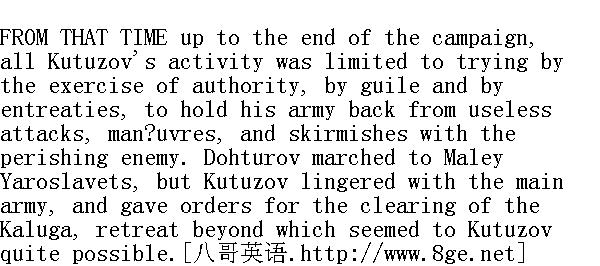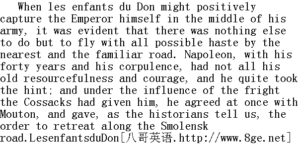曾经作为这支军队的军人, 跟随头目逃跑, 不知道逃向何方, 只有一个愿望(拿破仑和每个士兵都是这样), 尽快逃离这个虽然尚不明确, 然而谁都意识到的绝境。 At the council in Maley Yaroslavets, when the French generals, affecting to be deliberating, gave various opinions as to what was to be done, the opinion of the blunt soldier, Mouton, who said what all were thinking, that the only thing to do was to get away as quickly as possible, closed every one's mouth; and no one, not even Napoleon, could say anything in opposition to this truth that all recognised. 正因为这样, 在小雅罗斯拉维茨会次上, 将军们假装正经地商议, 发表各种意见, 憨直的军人穆顿说出了大家想说的话--只有尽快逃跑, 他这个最后的意见一下堵住了大家的嘴, 没有人, 甚至拿破仑, 都说不出什么来反对这个大家都已经意识到了的真理。 But though everybody knew that they must go, there was still a feeling of shame left at acknowledging they must fly. And some external shock was necessary to overcome that shame. And that shock came when it was needed. It was le Hourra de l'Empereur, as the French called it. 虽然大家都知道应该逃走, 但是仍羞于承认这一点。还需要一个外界的推力来克服这种羞辱感。这一推力适时出现了。就是法国人所谓的leHourradeI'empereur①。 ①法语: 皇帝, 乌拉!(指俄国军队冲锋时的喊声。) On the day after the council, Napoleon, on the pretext of inspecting the troops and the field of a past and of a future battle, rode out early in the morning in the midst of the lines of his army with a suite of marshals and an escort. The Cossacks, who were in search of booty, swept down on the Emperor, and all but took him prisoner. What saved Napoleon from the Cossacks that day was just what was the ruin of the French army, the booty, which here as well as at Tarutino tempted the Cossacks to let their prey slip. Without taking any notice of Napoleon, they dashed at the booty, and Napoleon succeeded in getting away. 会后的第二天, 拿破仑佯装视察军队和先前的与未来的战场, 大早率领一群元帅和卫队, 骑着马穿行于军中。到处寻找战利品的哥萨克碰上了这位皇帝, 差一点捉住他。如果说哥萨克这次没有捉住拿破仑, 救了他同时也是毁了他的那个东西--战利品, 在塔鲁丁诺和在这里, 哥萨克不去抓人, 都扑向战利品。他们没有注意拿破仑, 扑向战利品, 他逃脱了。