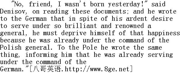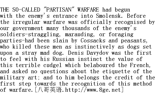 从敌军进入斯摩棱斯克城的时候起, 这种被称为游击战的战争就开始了。 在游击战尚未被政府正式承认之前, 已经有数千名法军士兵--掉队的抢掠兵和征粮士兵--被哥萨克和农民杀掉, 他们打死这些法军是不自觉的, 就像一群狗咬死一条丧家的疯狗一样。杰尼斯·达维多夫, 以其俄罗斯人的敏觉, 第一个认识到这件可怕的武器的意义, 他不管什么战争艺术规则, 使用这种武器消灭法国人, 使这种战争合法化的首功应归于他。 The first detachment of irregulars-Davydov's-was formed on the 24th of August, and others soon followed. In the latter stages of the campaign these detachments became more and more numerous. 八月二十四日达维多夫组建了第一支游击队, 紧接着别的游击队也组成了。战争愈向前推进, 游击队就愈来愈多。 The irregulars destroyed the Grande Armee piecemeal. They swept up the fallen leaves that were dropping of themselves from the withered tree, and sometimes they shook the tree itself. By October, when the French were fleeing to Smolensk, there were hundreds of these companies, differing widely from one another in number and in character. Some were detachments that followed all the usual routine of an army, with infantry, artillery, staff-officers, and all the conveniences of life. Some consisted only of Cossacks, mounted men. Others were small bands of men, on foot and also mounted. Some consisted of peasants, or of landowners and their serfs, and remained unknown. There was a deacon at the head of such a band, who took several hundred prisoners in a month. There was the village elder's wife, Vassilisa, who killed hundreds of the French. 游击队各个歼灭那支大军。他们歼灭那些就像从枯树上掉下的落叶一样的法国军队, 他们时而还要摇晃一下这棵枯树。到了十月, 也就是法国人往斯摩棱斯克逃跑时, 这些大大小小性质各异的游击队就已经发展到有几百个了。有的游击队完全仿效军队, 有步兵、骑兵、司令部, 携带着生活用品;有的只有哥萨克骑兵;有些是小股的, 步兵和骑兵混杂的, 还有些是谁也弄不清是从哪里来的农民和地主。有一个游击队的头头是一所教堂的勤杂工, 他在一个月的时间里抓获了几百名俘虏。有一个村长的老婆名叫瓦西里萨, 她一个人打死了几百个法国人。 The latter part of October was the time when this guerilla warfare reached its height. That period of this warfare, in which the irregulars were themselves amazed at their own audacity, were every moment in dread of being surrounded and captured by the French, and never unsaddling, hardly dismounting, hid in the woods, in momentary expectation of pursuit, was already over. The irregular warfare had by now taken definite shape; it had become clear to all the irregulars what they could, and what they could not, accomplish with the French. By now it was only the commanders of detachments marching with staff-officers according to the rules at a distance from the French who considered much impossible. The small bands of irregulars who had been at work a long while, and were at close quarters with the French, found it possible to attempt what the leaders of larger companies did not dare to think of doing. The Cossacks and the peasants, who crept in among the French, thought everything possible now. 十月下旬, 游击战争达到高潮。这是战争的第一阶段, 在这一阶段, 游击队自己都为他们的胆大而吃惊, 他们时刻提防着被法军活捉或者被包围, 因此, 他们总是马不离鞍, 人不离马, 隐藏在森林里, 俟机袭击敌人, 现在, 这一阶段已成为过去。战争已明朗化, 人人都知道, 应当怎样和法国人进行斗争。此刻只有那些建立有司令部的大游击队的头头们把他们的司令部设在离法国人较远的地方, 他们仍然认为有许多事情是不可能办得到的。那些早就开始战斗, 总是在近处窥视法国人行动的小股游击队, 他们认为那些大的游击队队长们连想都不敢想的事情, 他们也能办到。哥萨克和农民们潜入法国人之中, 他们则认为, 现在一切都能办到。 On the 22nd of October, Denisov, who was a leader of a band of irregulars, was eagerly engaged in a typical operation of this irregular warfare. From early morning he had been with his men moving about the woods that bordered the high road, watching a big convoy of cavalry baggage and Russian prisoners that had dropped behind the other French troops, and under strong escort-as he learned from his scouts and from prisoners-was making its way to Smolensk. Not only Denisov and Dolohov (who was also a leader of a small band acting in the same district) were aware of the presence of this convoy. Some generals in command of some larger detachments, with staff-officers also, knew of this convoy, and, as Denisov said, their mouths were watering for it. Two of these generals-one a Pole, the other a German-had almost at the same time sent to Denisov an invitation to join their respective detachments in attacking the convoy. 十月二十二日, 游击队员杰尼索夫和他的伙伴们斗志昂扬, 一大早他们就开始行动。他们全天都在靠近大路的森林中监视一支押运骑兵物资和俄国俘虏的队伍, 他们与其余法军距离较远, 但加强了掩护, 据俘虏的口供和侦察员的报告, 证实了是开往斯摩棱斯克的。获悉这支运输队行动的不仅是杰尼索夫和在杰尼索夫附近活动的多洛霍夫(他也率领了一支不大的游击队), 而且还有几个建有司令部的大游击队;大家都获悉了这支运输队的行动, 正如杰尼索夫所说, 大家都磨拳擦掌。这些大游击队中有两个队的头头--一个是波兰人, 另一个是德国人--差不多同时给杰尼索夫来信, 邀请杰尼索夫与